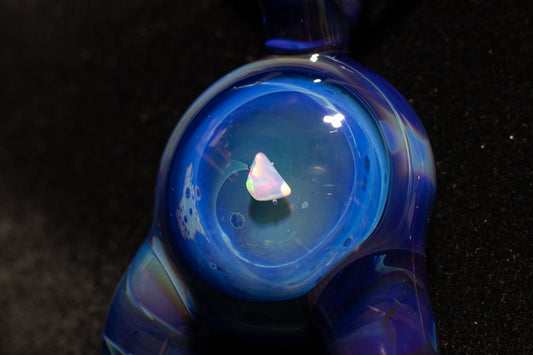 Blue Amber Purple Talisman with Encased Opal | Borosilicate Pendant Necklace | Sculpted Horn Pendant