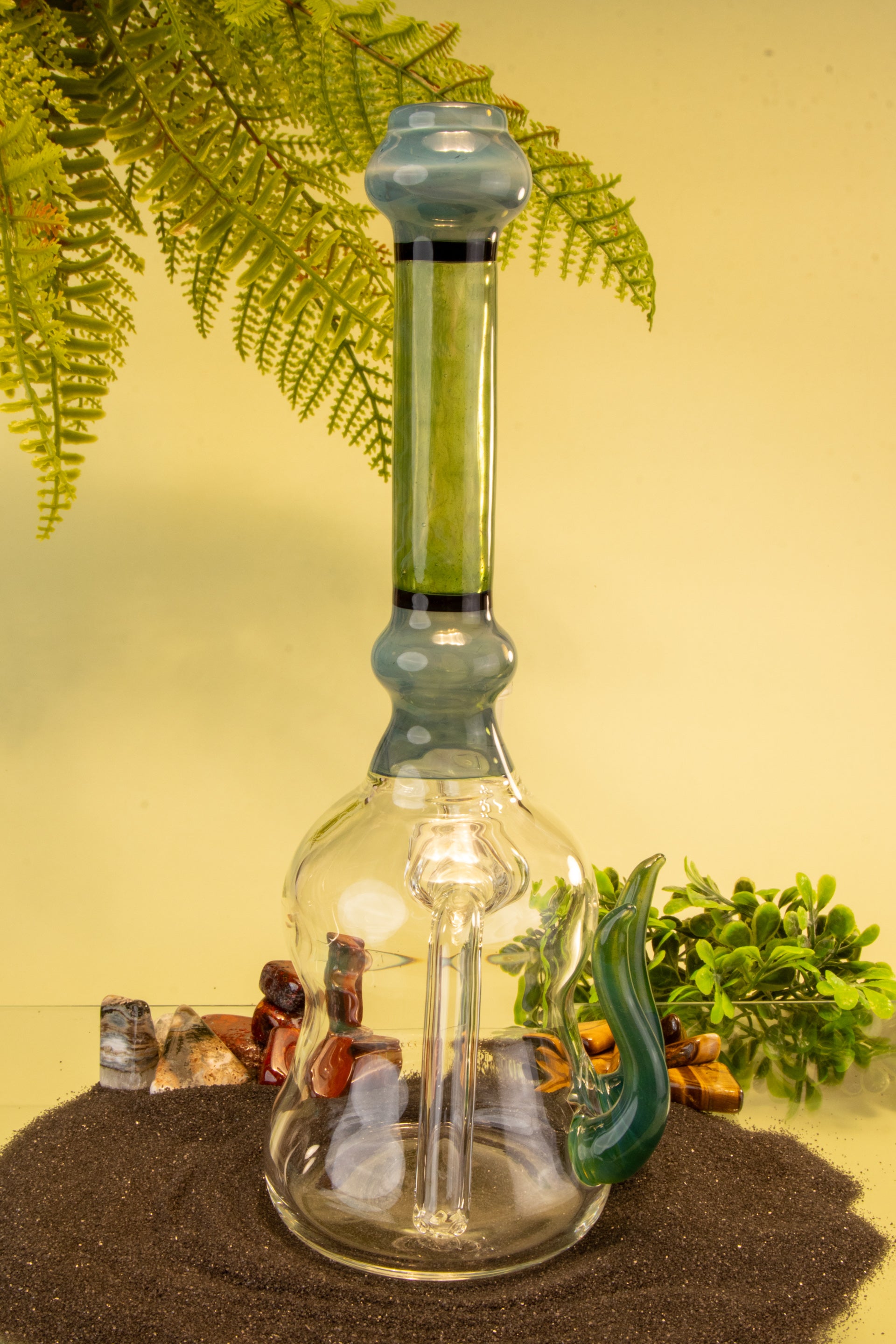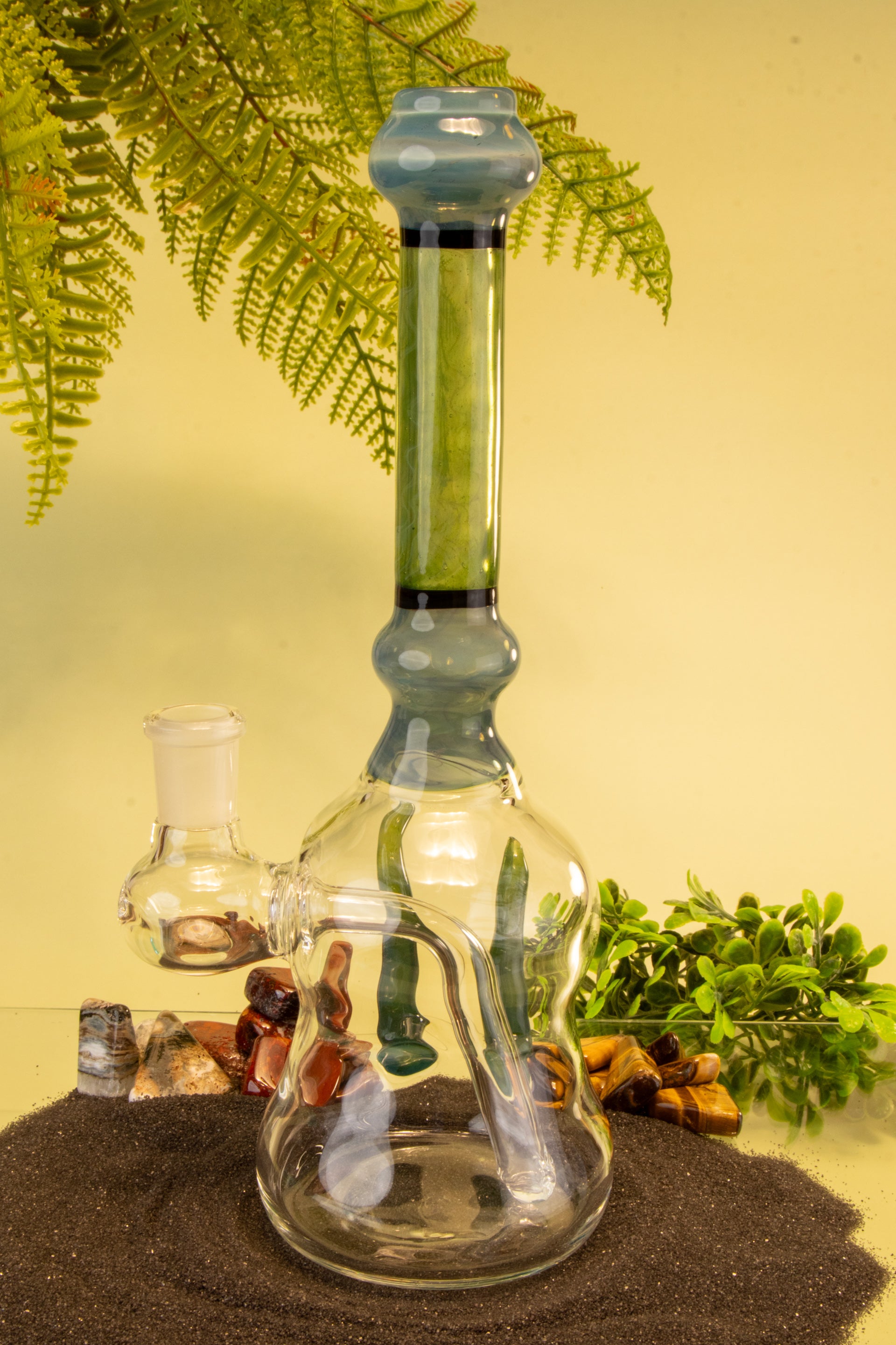 This rig has a 14mm ground glass joint, with a three hole diffuser. Top is made with fumed colored sections and a sparkled Mystery Aventurine mid-section. Size is 9.75 inches tall.