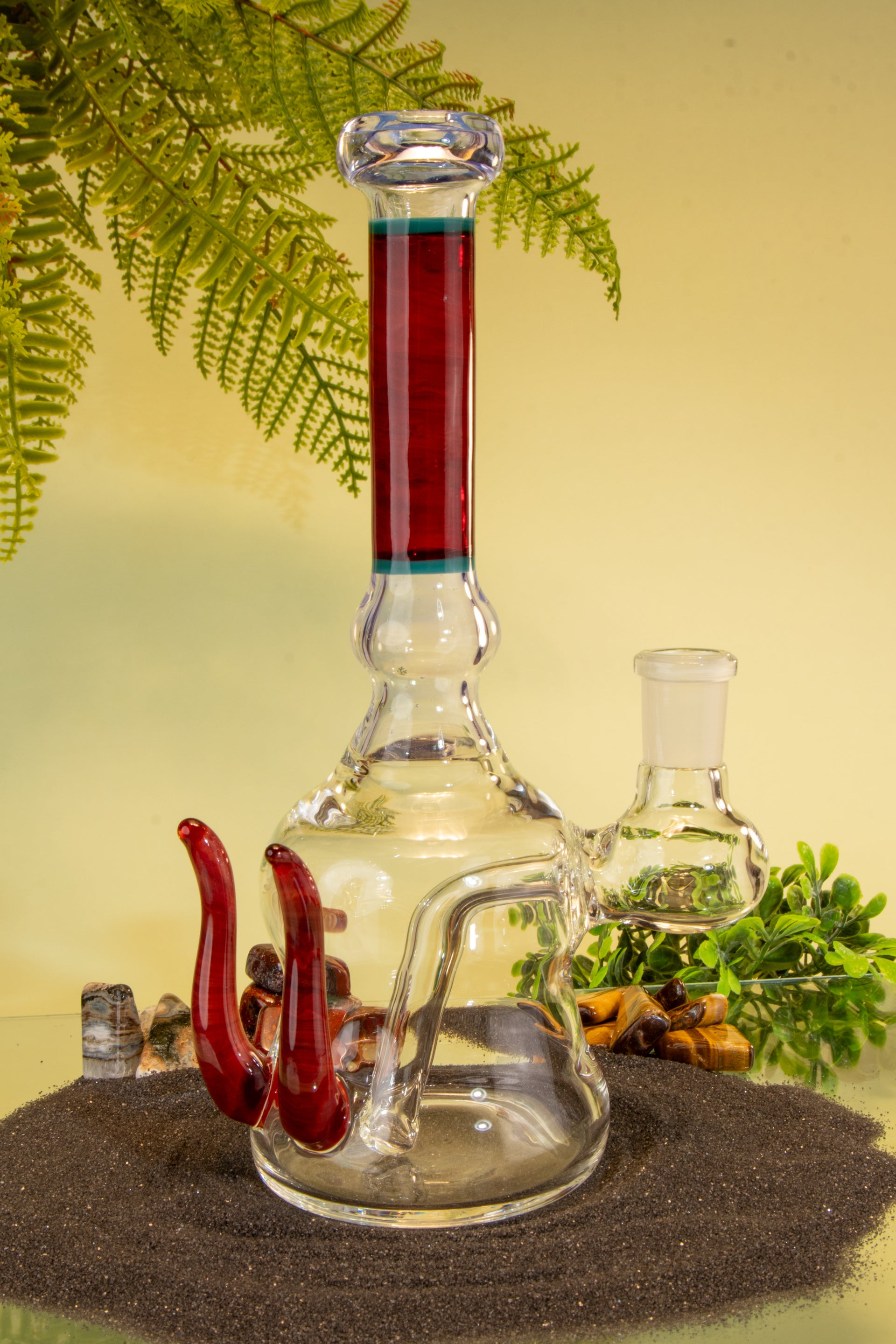 This rig has a 14mm ground glass joint, with a three hole diffuser. Top is made with Lucid colored sections and a cherry brandy mid-section. Size is 9 inches tall.