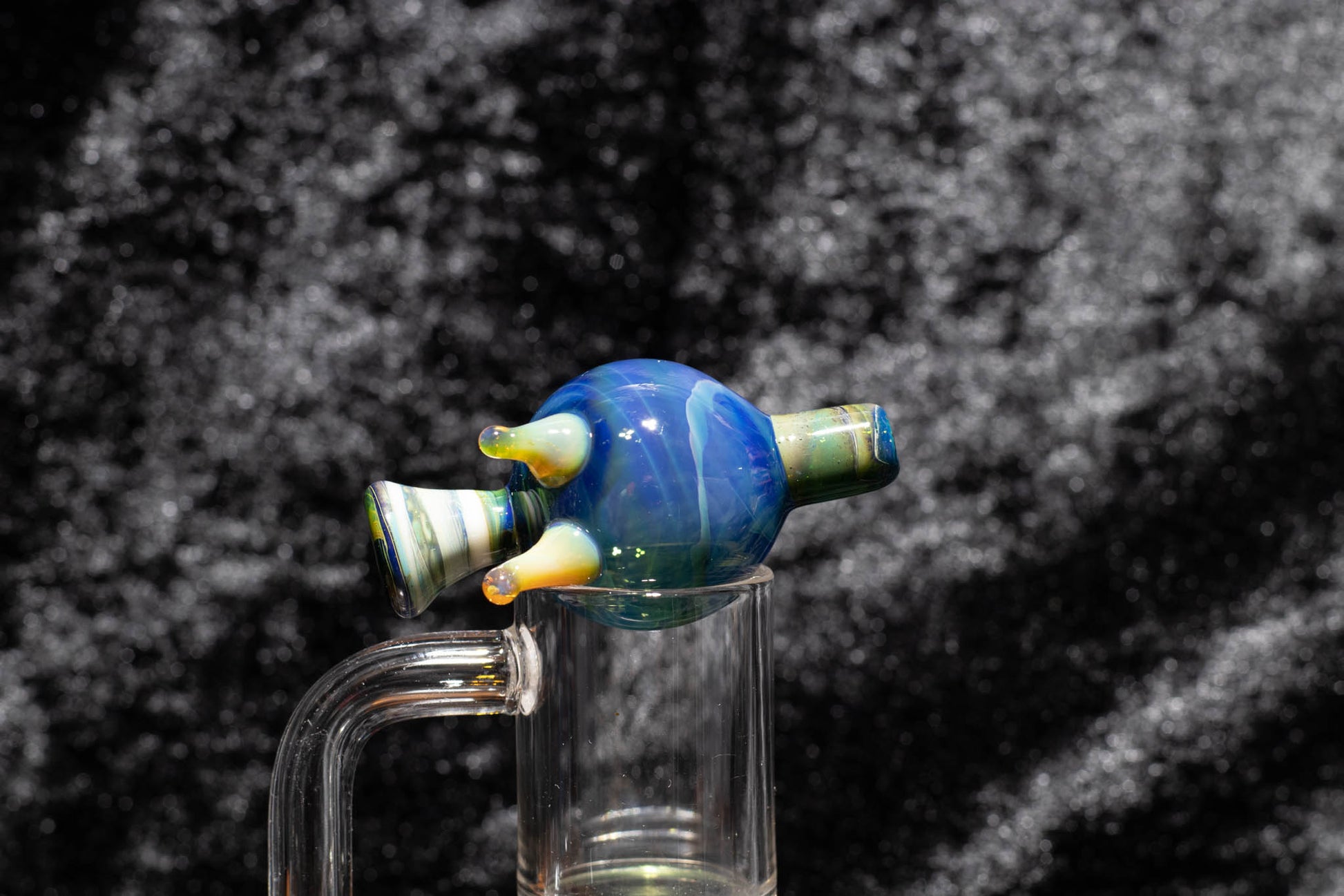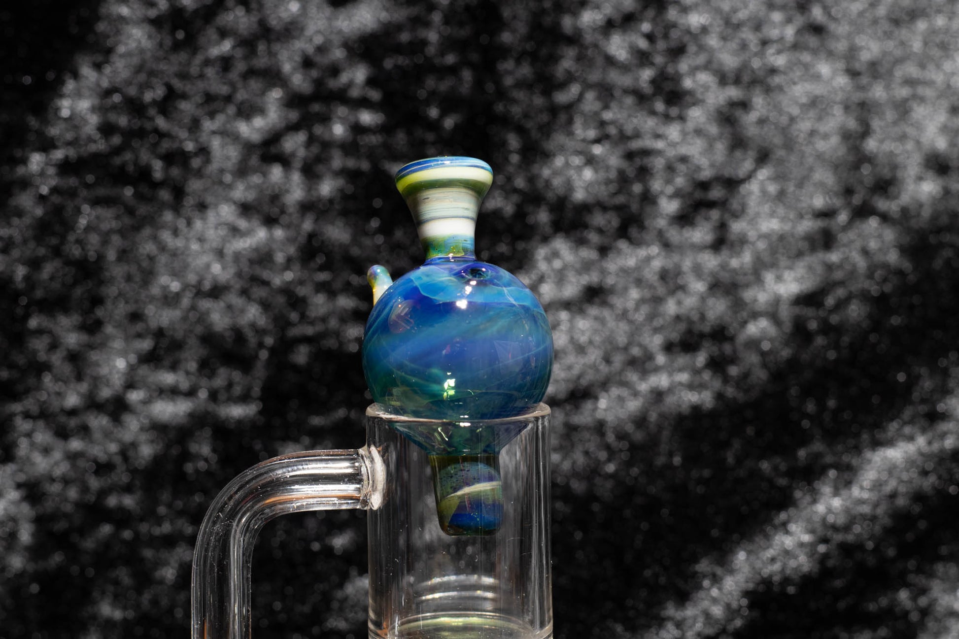 This 25mm glass carb cap is a handcrafted functional art piece designed to fit 20–25mm glass fittings. Made with multiple layers of colored glass, the dome features a round bubble shape and a small side inlet, as well as anti-roll dots for stability.
