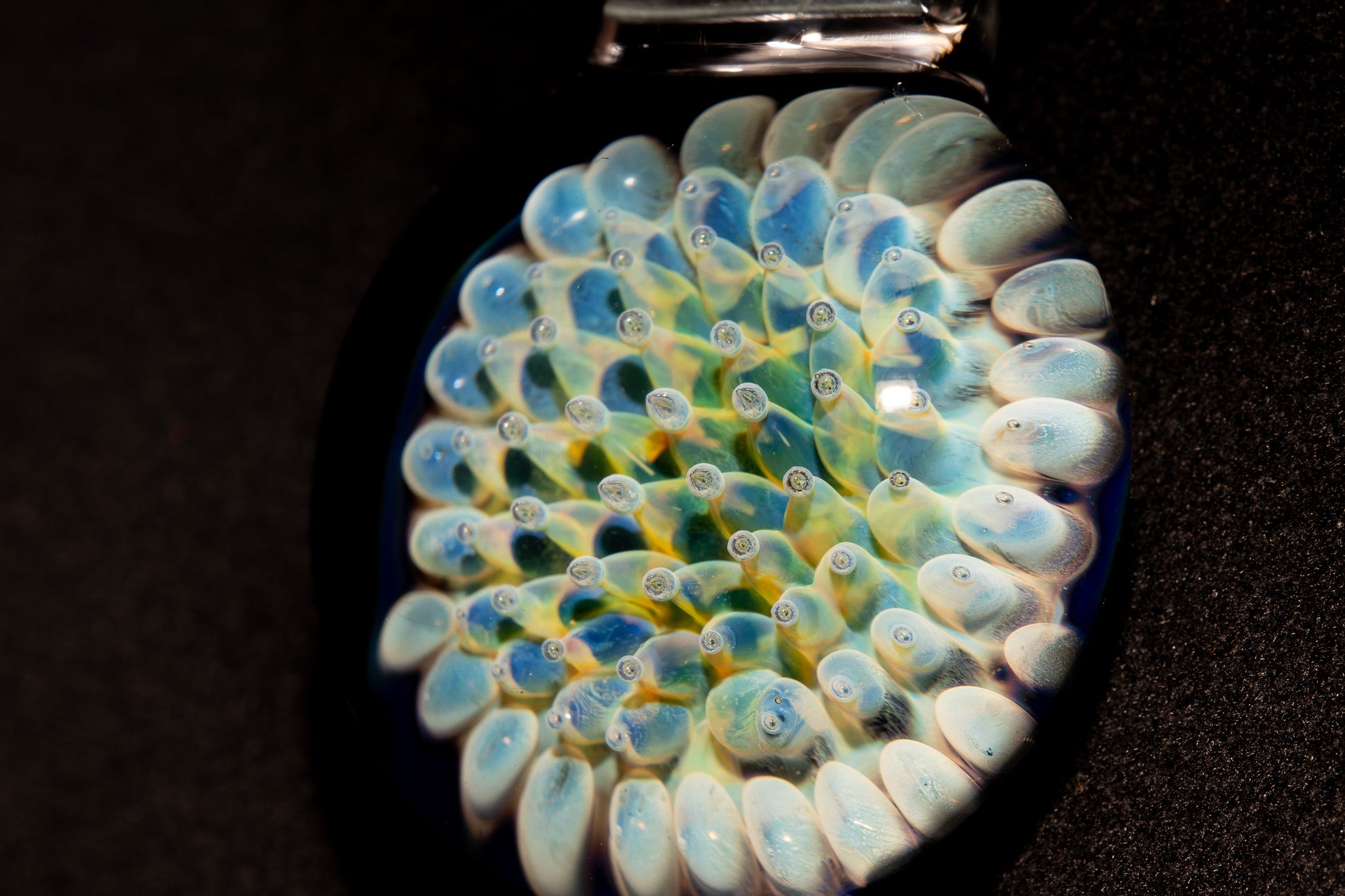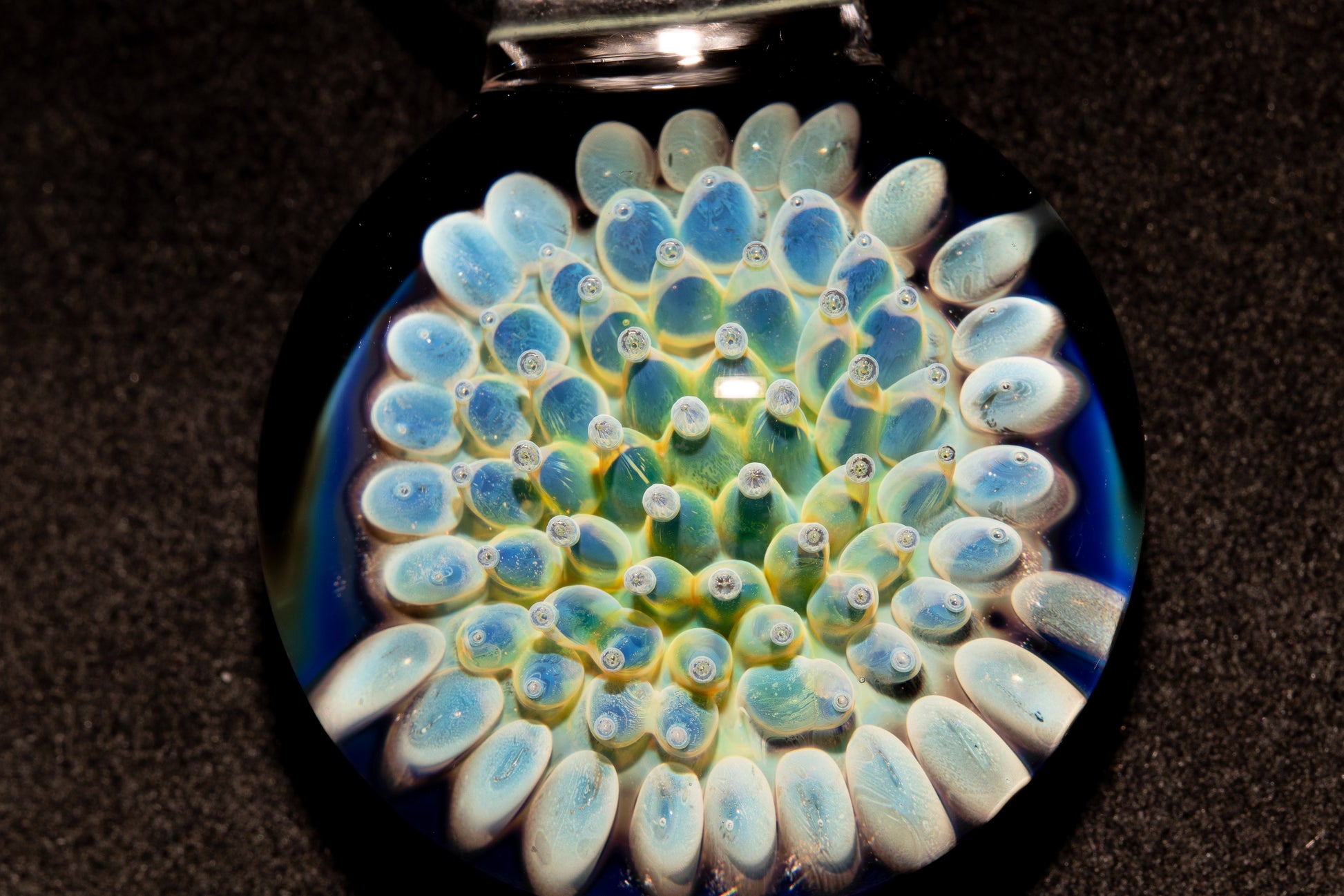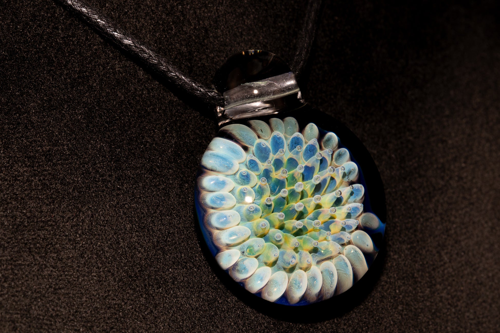 Each tiny bubble is formed through the air trap technique, where colored glass encases a breath of air, giving the pendant its signature sparkle, reflection, and layered depth. Set against a dark backing, the colors burst forward with striking contrast, creating a piece that feels both deep and luminous.