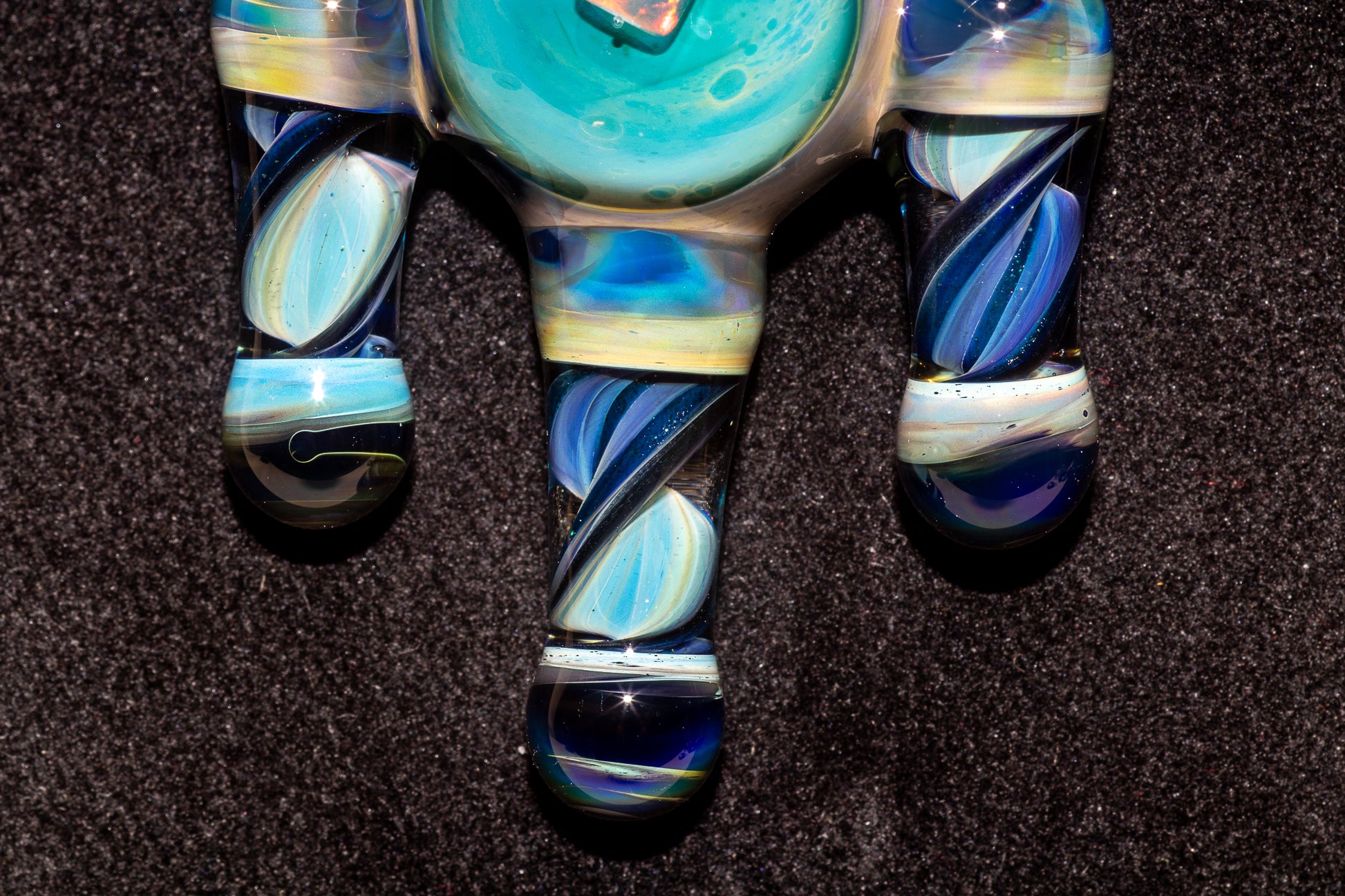 An opal is first encased in a clear glass tube. Then a colored ball of glass is formed for the opal to be attached to. I striped and encased lines of colored glass between layers of clear glass and twisted them into spirals. The ends of the spirals are coated with more colored glass and added to the encased opal. A matching bail is finally added to bring together this beautiful glass talisman.