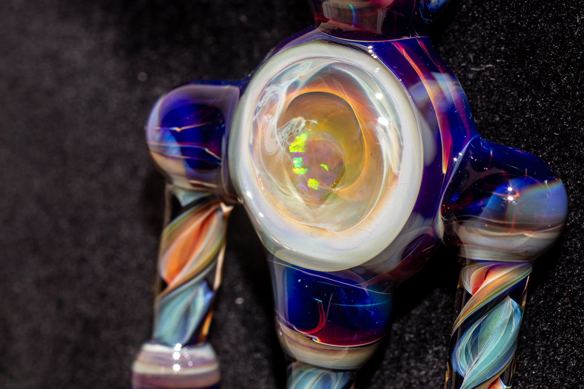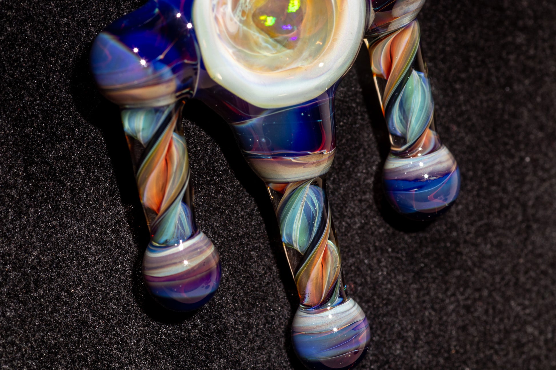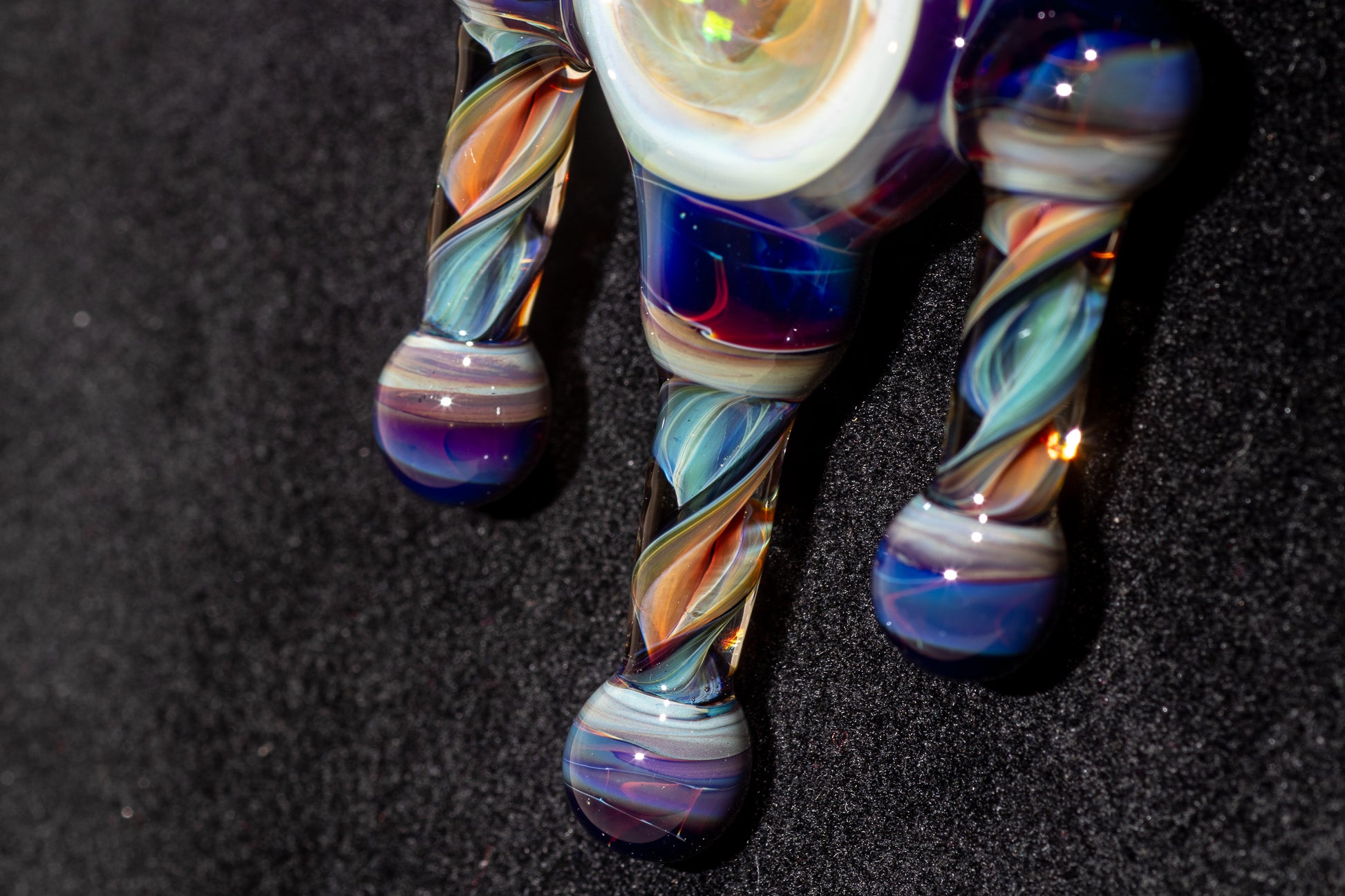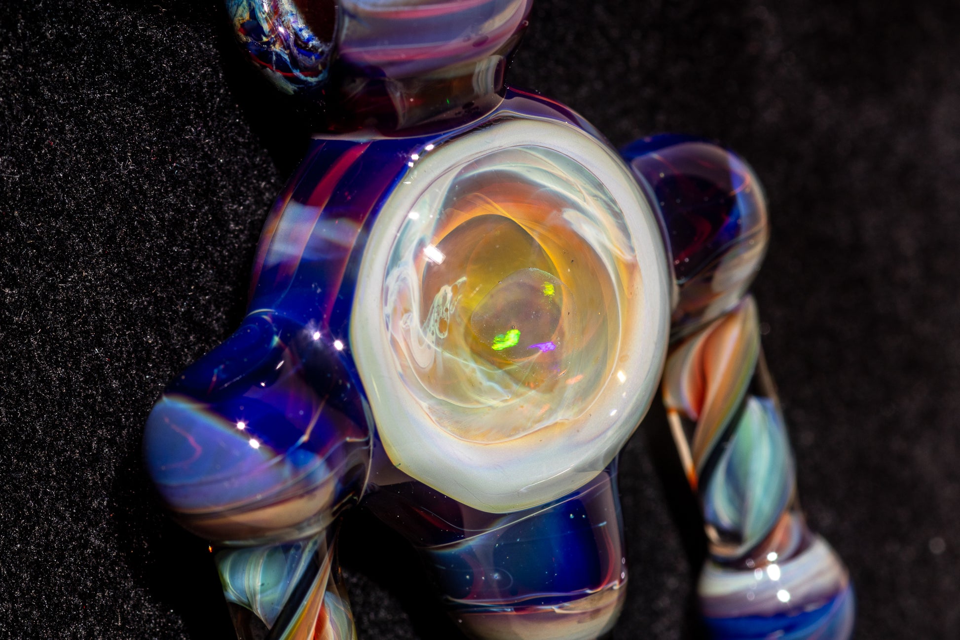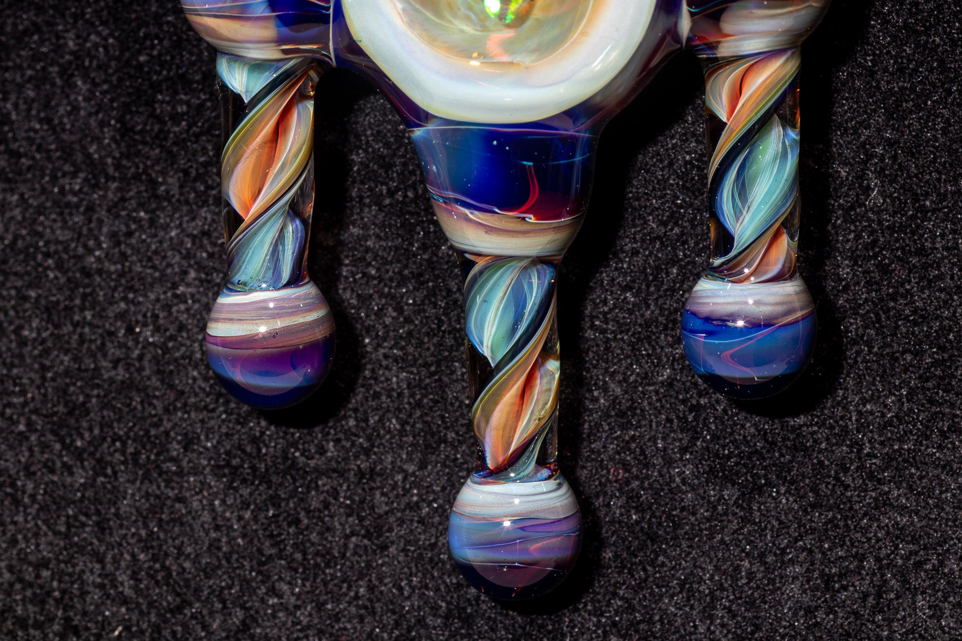 An opal is first encased in a clear glass tube. Then a colored ball of glass is formed for the opal to be attached to. I striped and encased lines of colored glass between layers of clear glass and twisted them into spirals. The ends of the spirals are coated with more colored glass and added to the encased opal. A matching bail is finally added to bring together this beautiful glass talisman.