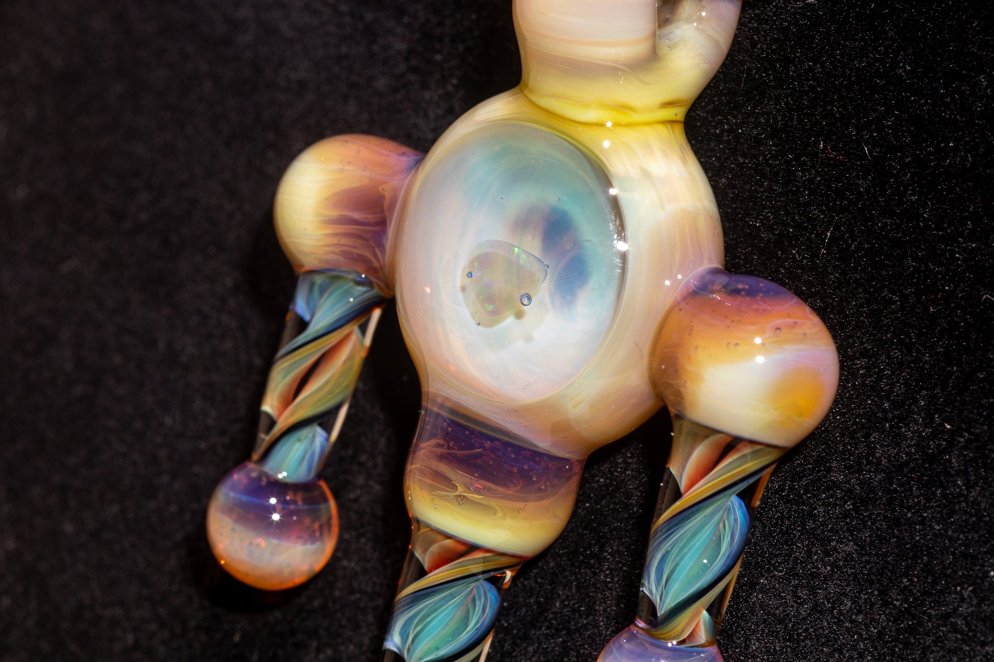 An opal is first encased in a clear glass tube. Then a colored ball of glass is formed for the opal to be attached to. I striped and encased lines of colored glass between layers of clear glass and twisted them into spirals. The ends of the spirals are coated with more colored glass and added to the encased opal. A matching bail is finally added to bring together this beautiful glass talisman.