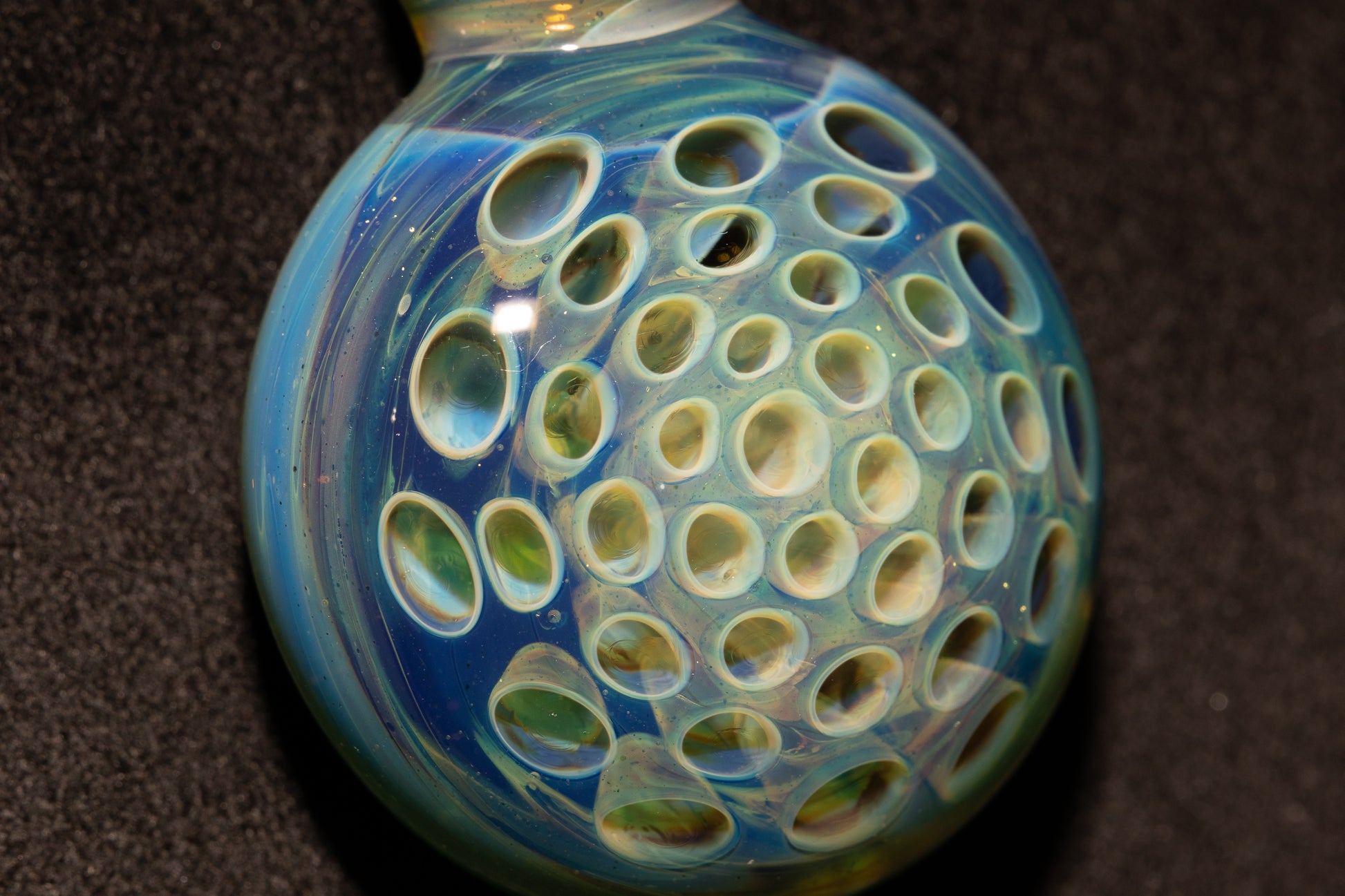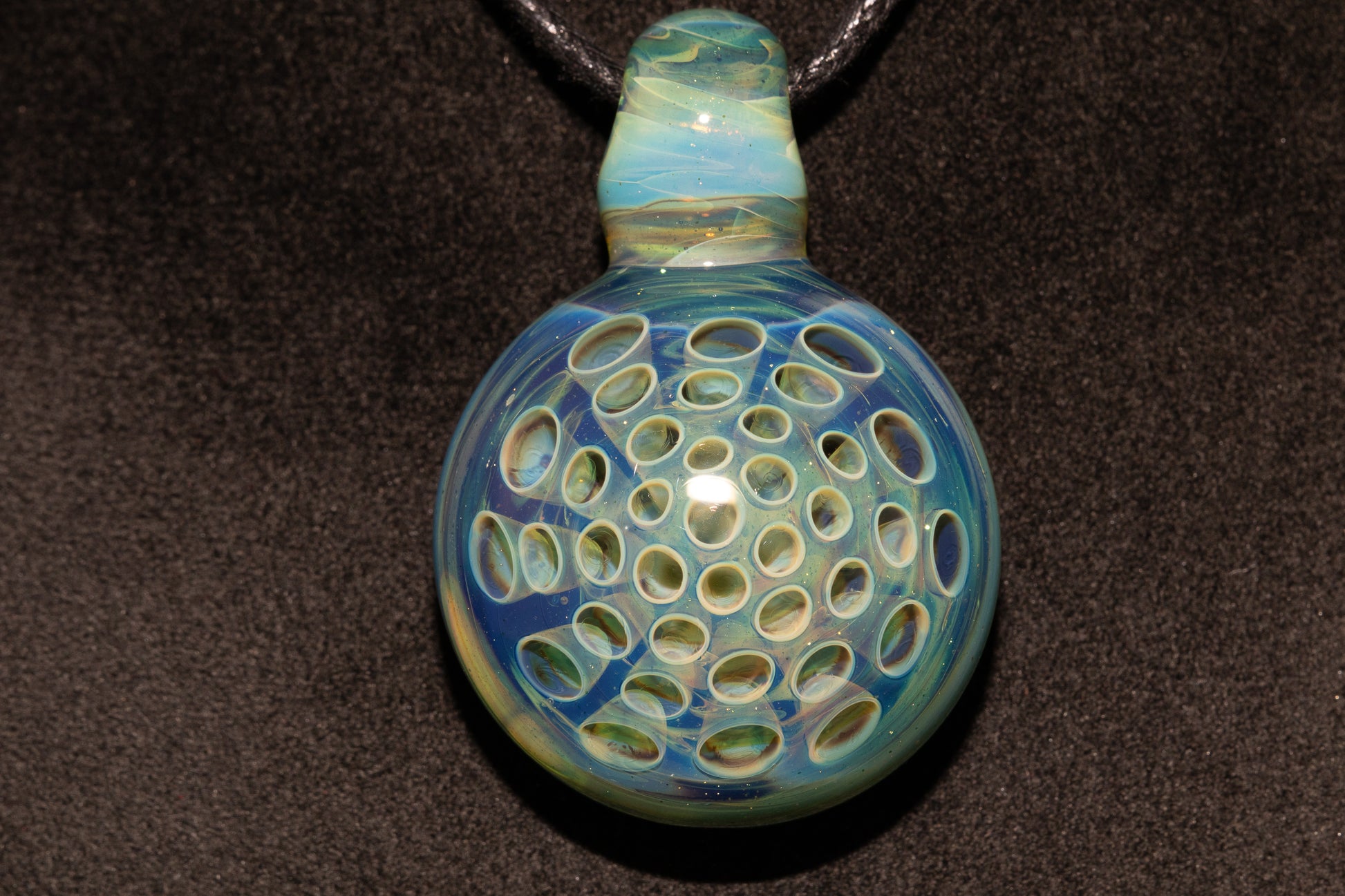 This pendant’s thick, clear form adds depth and durability while allowing light to play across the intricate pod-like shapes within. Whether worn for its symbolism, admired for its artistry, or collected as a unique piece of glasswork, it is a pendant that speaks to both
