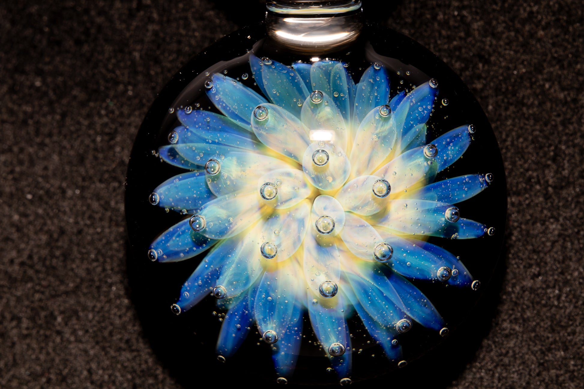 Each tiny bubble is formed through the air trap technique, where colored glass encases a breath of air, giving the pendant its signature sparkle, reflection, and layered depth. Set against a dark backing, the colors burst forward with striking contrast, creating a piece that feels both deep and luminous.