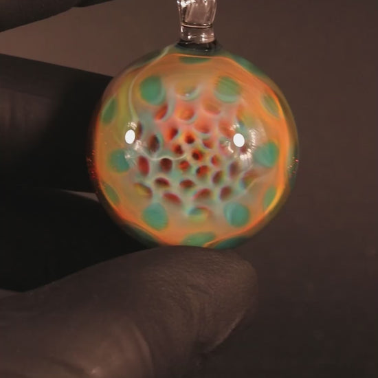 From there, dozens of clear dots are applied in a honeycomb pattern, drawing the fumed colors inward like a vortex. The bubble is collapsed and melted into a solid lens, preserving the dots. The back is coated in sparkled black to enhance the depth and reveal the full iridescent rainbow from within.