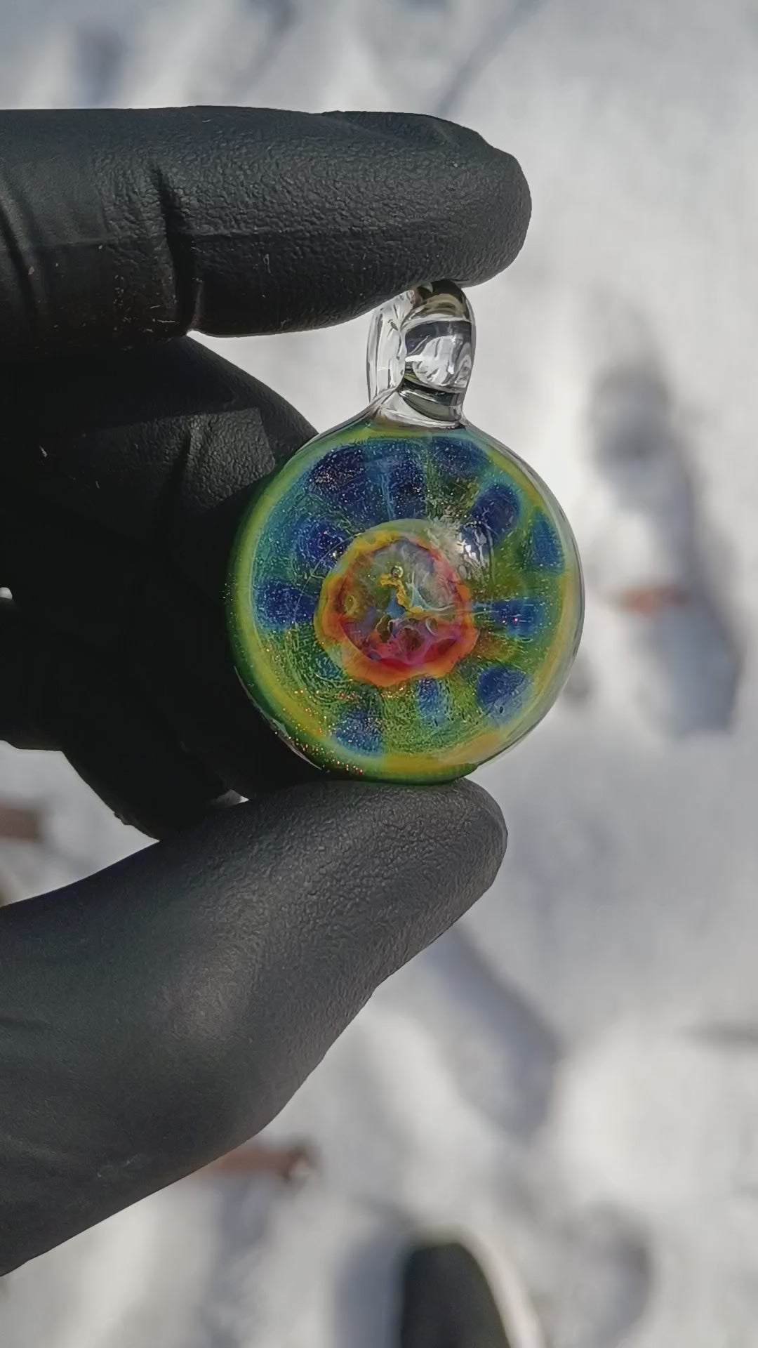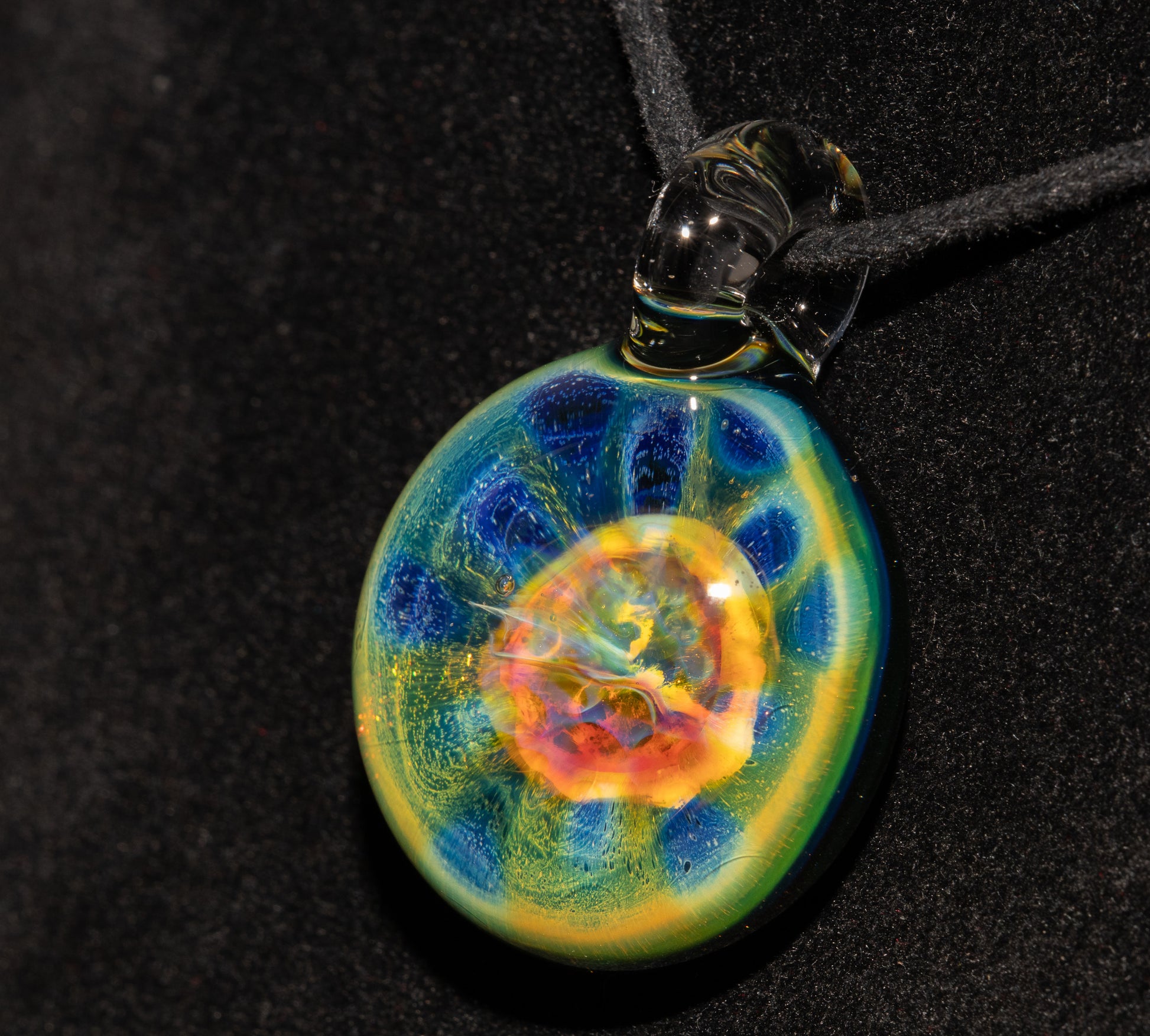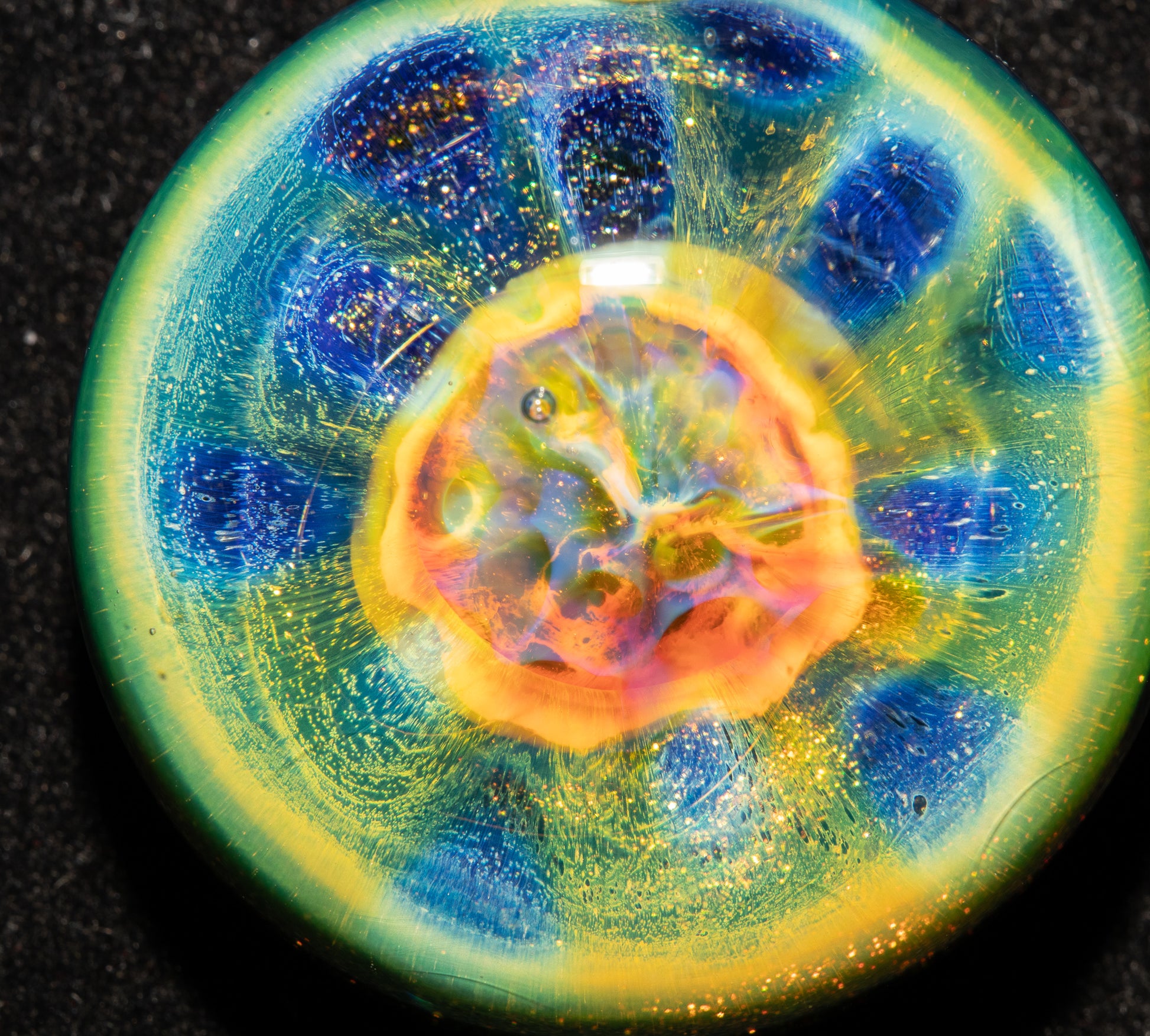 From there, dozens of clear dots are applied in a honeycomb pattern, drawing the fumed colors inward like a vortex. The bubble is collapsed and melted into a solid lens, preserving the dots. The back is coated in sparkled black to enhance the depth and reveal the full iridescent rainbow from within.
