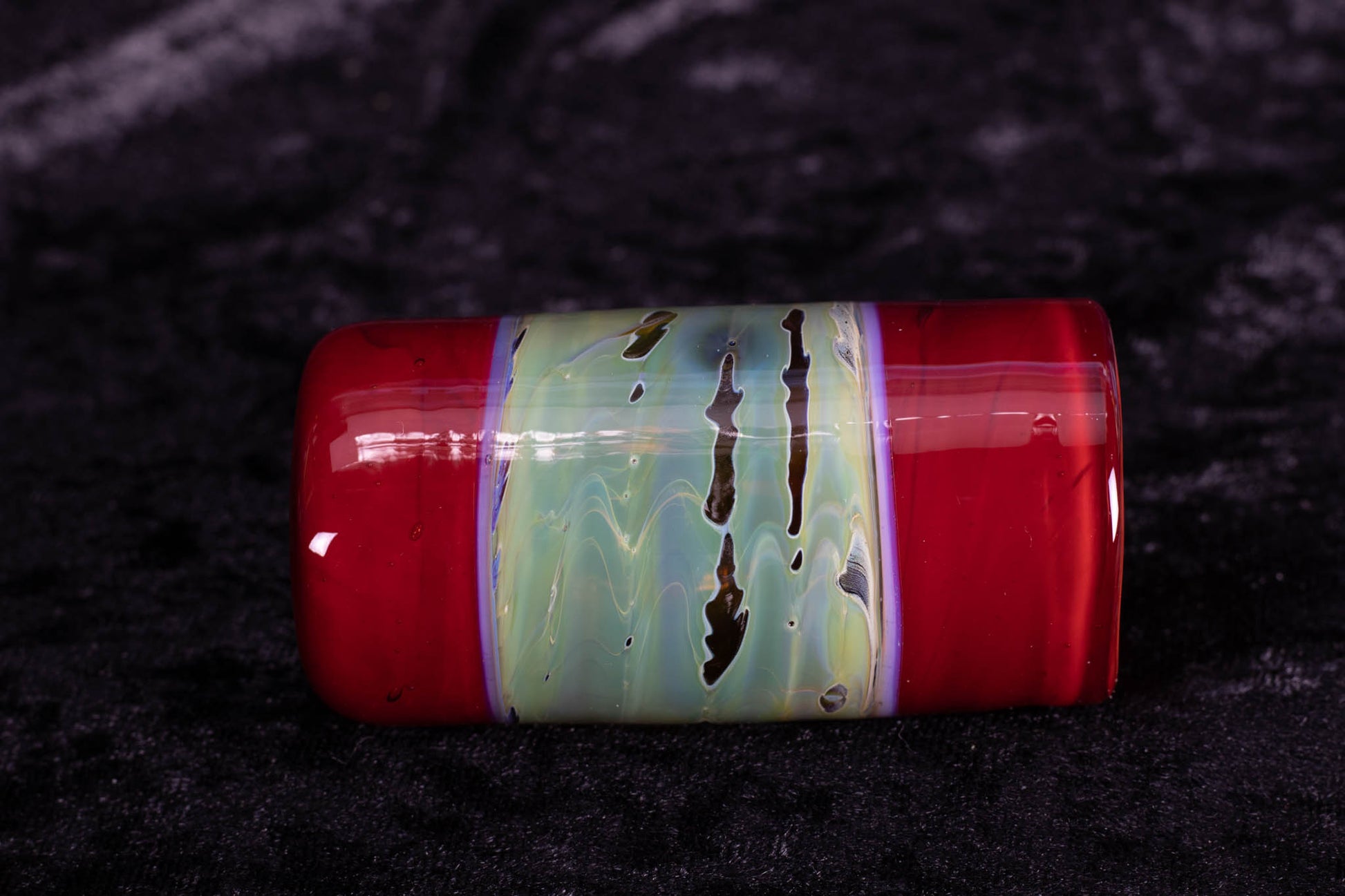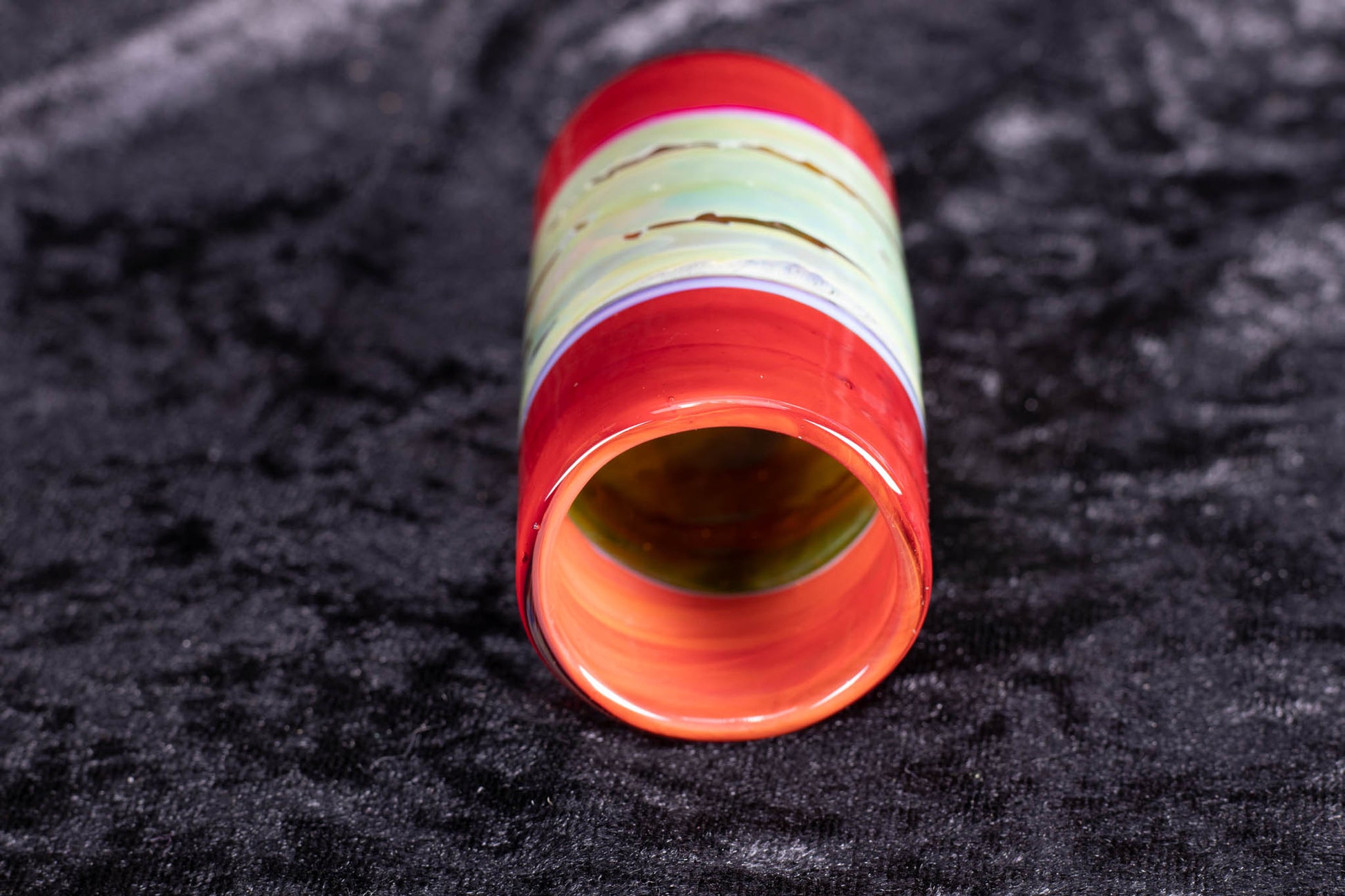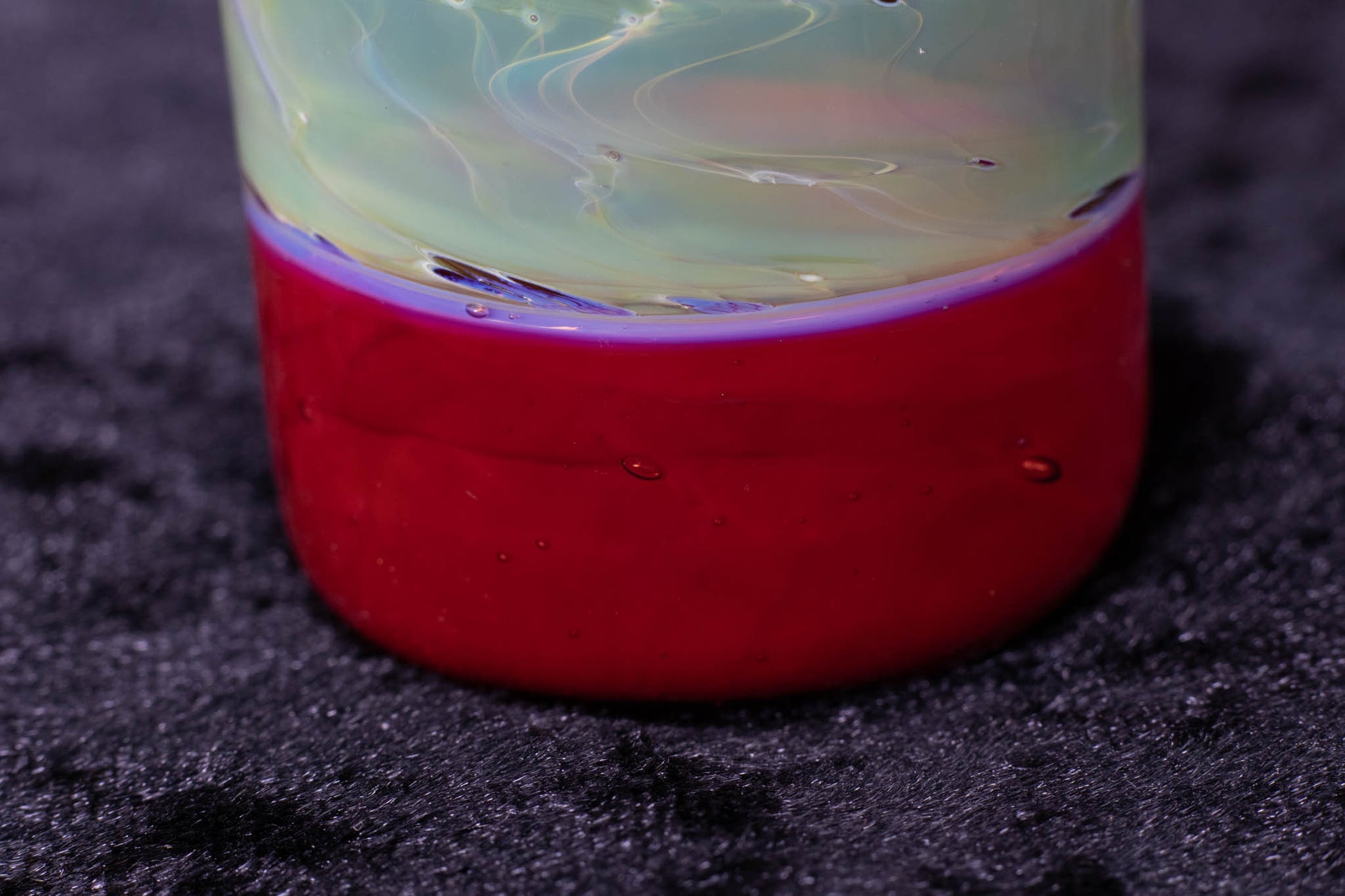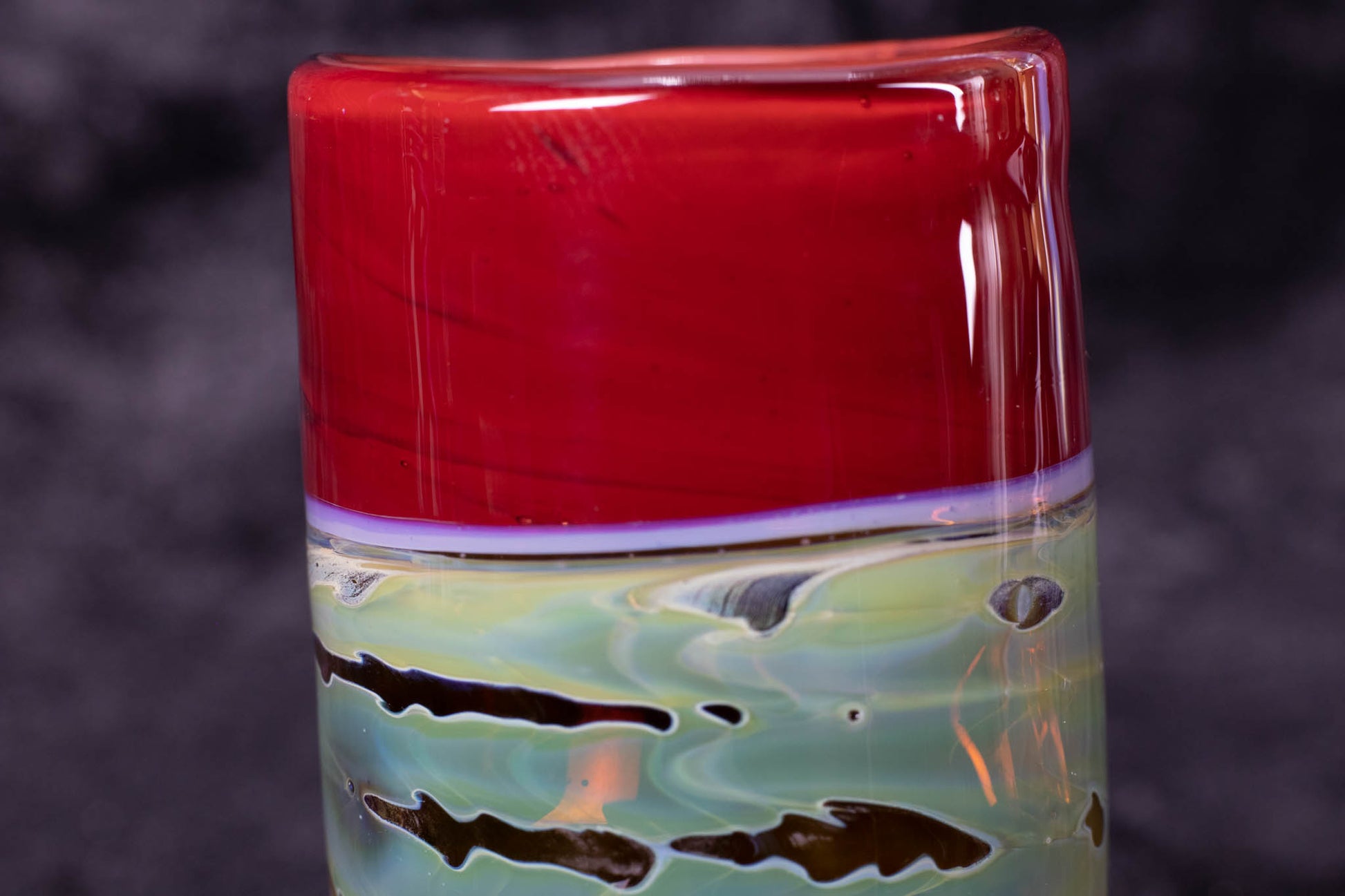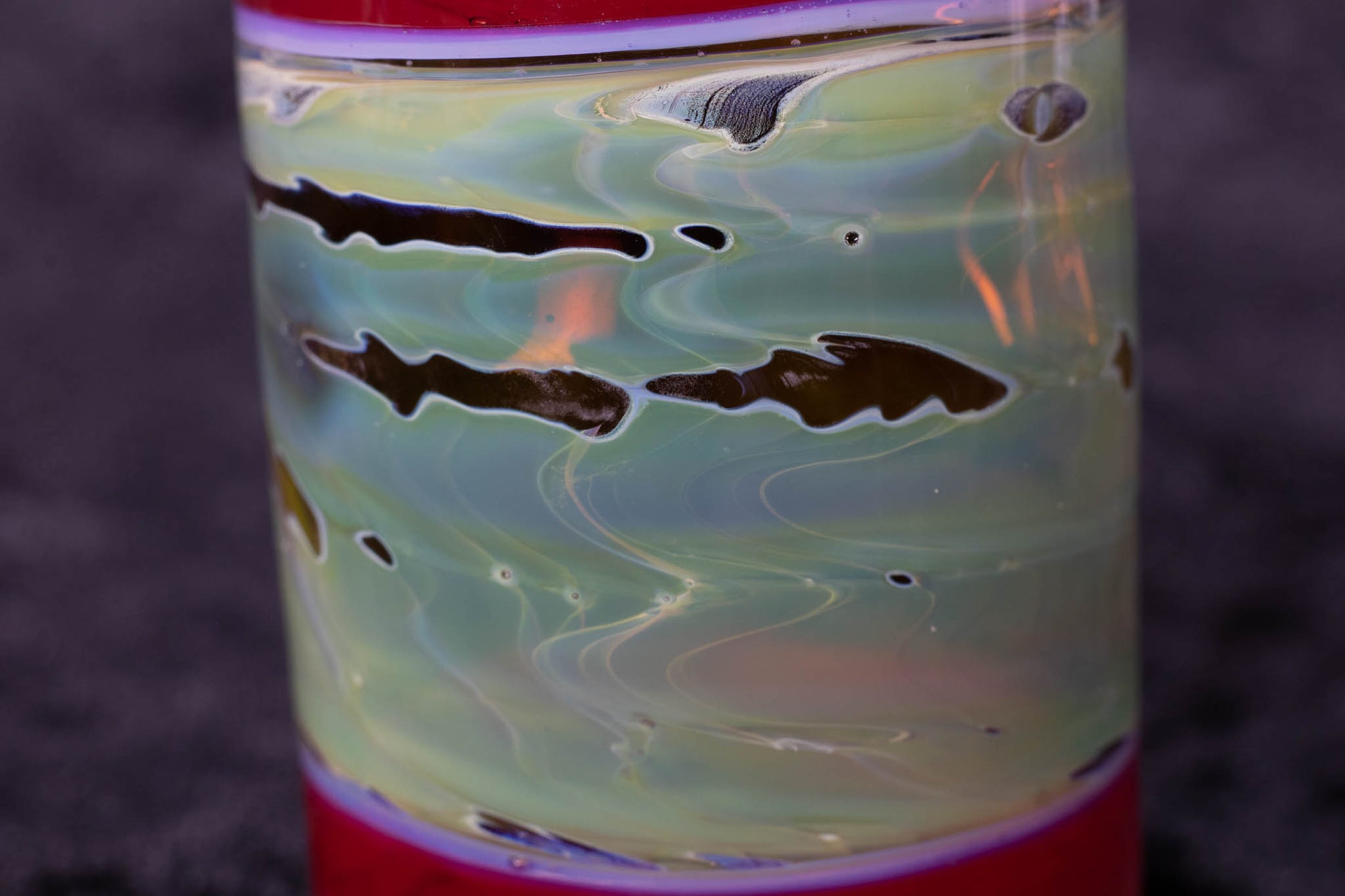 This shot glass is handblown with different colored sections of borosilicate glass. The shot glass is made with green Amber Purple over black, , Cherry Brandy, and Lucid lines. Always know which shot glass is yours!