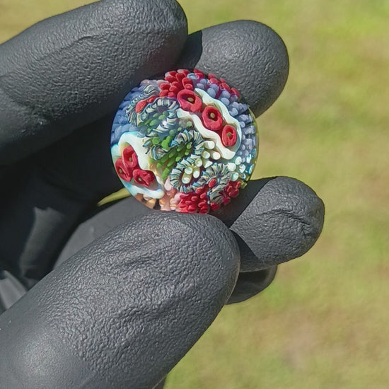 I start by blowing a thin bubble of glass, then carefully pull individual colored strings to create the coral reef details, including coral branches, anemones, and tiny dots reminiscent of sand, entirely by hand. Once the design is complete, I heat and implode the piece into a solid marble, cut the tubing, and flip it to reveal the intricate “painted” designs. Finally, I remove excess clear glass to form a clean lens that magnifies the miniature reef, bringing every detail to life.