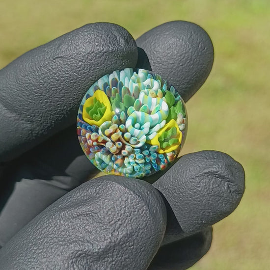 I start by blowing a thin bubble of glass, then carefully pull individual colored strings to create the coral reef details, including coral branches, anemones, and tiny dots reminiscent of sand, entirely by hand. Once the design is complete, I heat and implode the piece into a solid marble, cut the tubing, and flip it to reveal the intricate “painted” designs. Finally, I remove excess clear glass to form a clean lens that magnifies the miniature reef, bringing every detail to life.