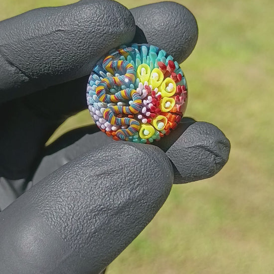 I start by blowing a thin bubble of glass, then carefully pull individual colored strings to create the coral reef details, including coral branches, anemones, and tiny dots reminiscent of sand, entirely by hand. Once the design is complete, I heat and implode the piece into a solid marble, cut the tubing, and flip it to reveal the intricate “painted” designs. Finally, I remove excess clear glass to form a clean lens that magnifies the miniature reef, bringing every detail to life.