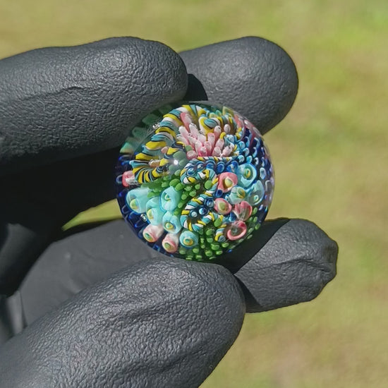 I start by blowing a thin bubble of glass, then carefully pull individual colored strings to create the coral reef details, including coral branches, anemones, and tiny dots reminiscent of sand, entirely by hand. Once the design is complete, I heat and implode the piece into a solid marble, cut the tubing, and flip it to reveal the intricate “painted” designs. Finally, I remove excess clear glass to form a clean lens that magnifies the miniature reef, bringing every detail to life.