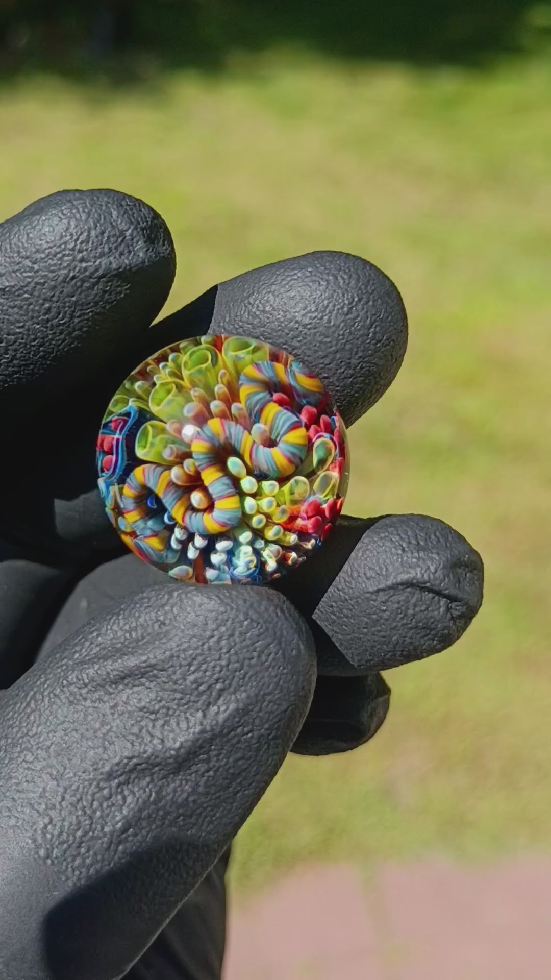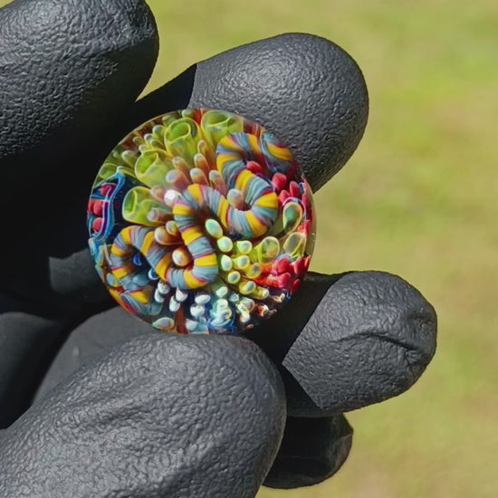 I start by blowing a thin bubble of glass, then carefully pull individual colored strings to create the coral reef details, including coral branches, anemones, and tiny dots reminiscent of sand, entirely by hand. Once the design is complete, I heat and implode the piece into a solid marble, cut the tubing, and flip it to reveal the intricate “painted” designs. Finally, I remove excess clear glass to form a clean lens that magnifies the miniature reef, bringing every detail to life.