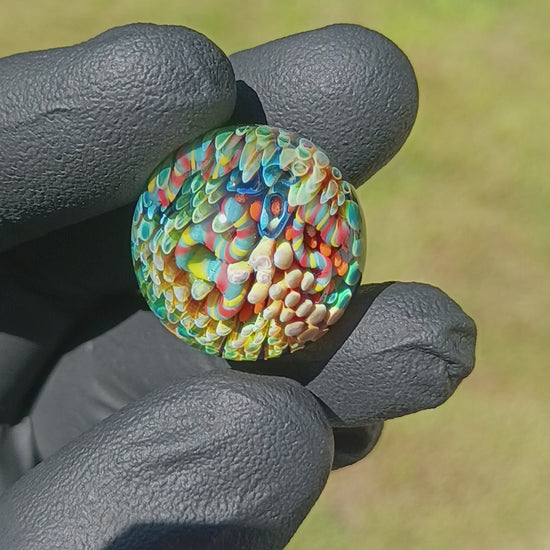 I start by blowing a thin bubble of glass, then carefully pull individual colored strings to create the coral reef details, including coral branches, anemones, and tiny dots reminiscent of sand, entirely by hand. Once the design is complete, I heat and implode the piece into a solid marble, cut the tubing, and flip it to reveal the intricate “painted” designs. Finally, I remove excess clear glass to form a clean lens that magnifies the miniature reef, bringing every detail to life.