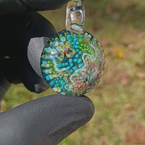 Dive into a miniature ocean with this intricately crafted glass coral reef implosion pendant. I begin by blowing a large, delicate clear bubble, then pull and layer multiple strands of colored glass. Each pendant is a unique seascape, “painted” with carefully mixed colors in dots, reefs, spirals, and twisting coral formations. I create my own latticino twists for the coral, some accented with subtle sparkles for a touch of shimmer.