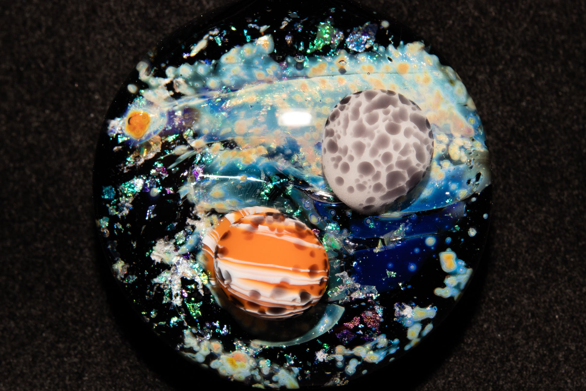 I back the pendant in jet black glass to enhance the depth and contrast, making every detail pop against the void of space. The combination of clear, luminous glass and reflective elements creates a miniature universe that feels alive, expansive, and endlessly fascinating.