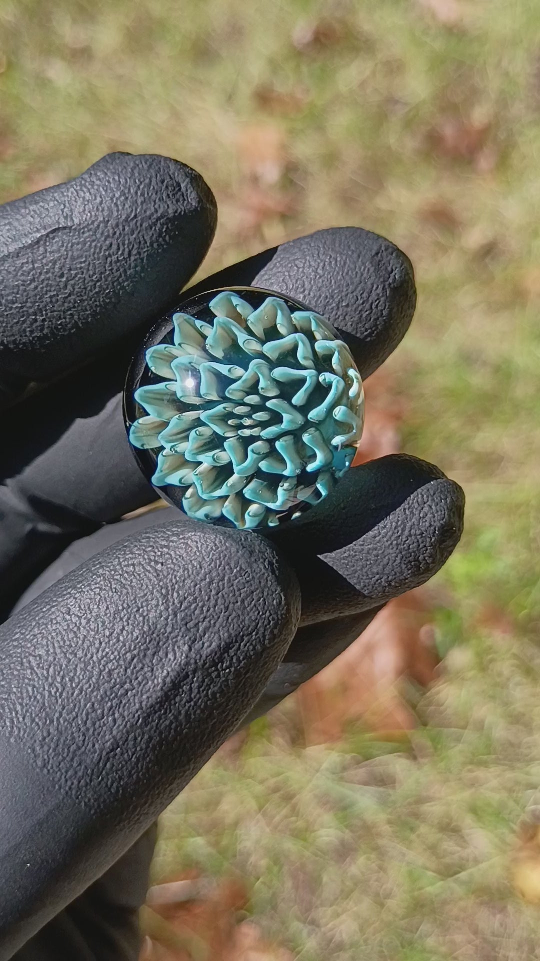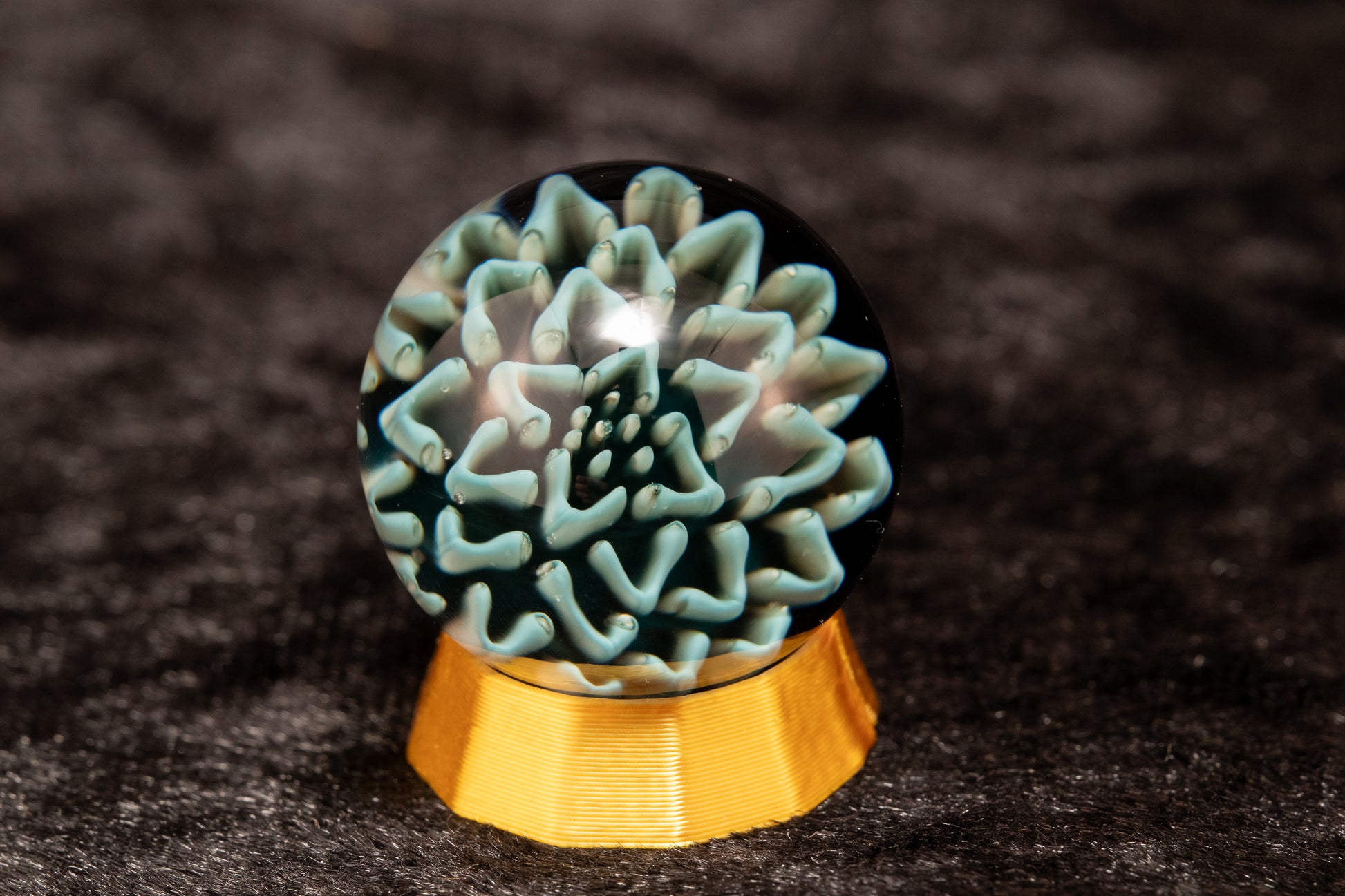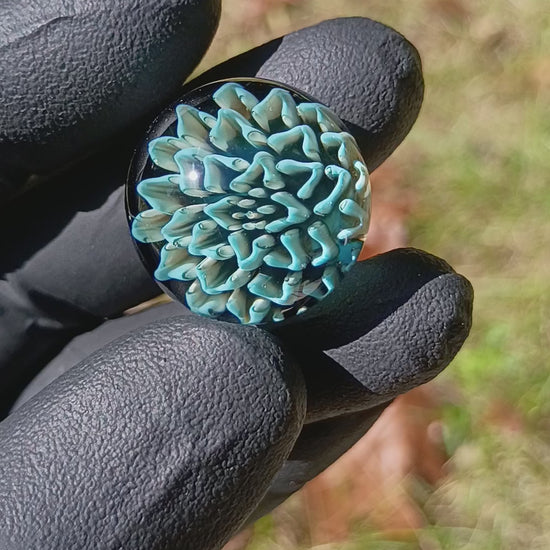 How It’s Made: I begin with a clear glass tube, blowing it into a delicate, thin bubble. Thin strings of colored glass are pulled and carefully applied to create a central dot design. From there, geometric V-shaped petals are drawn radiating outward, layering the pattern repeatedly to build depth and complexity. Once complete, the bubble is slowly melted back into a solid marble and the tube end is trimmed. Excess glass is cleared to create a crystal-clear window, revealing the layered floral design inside.
