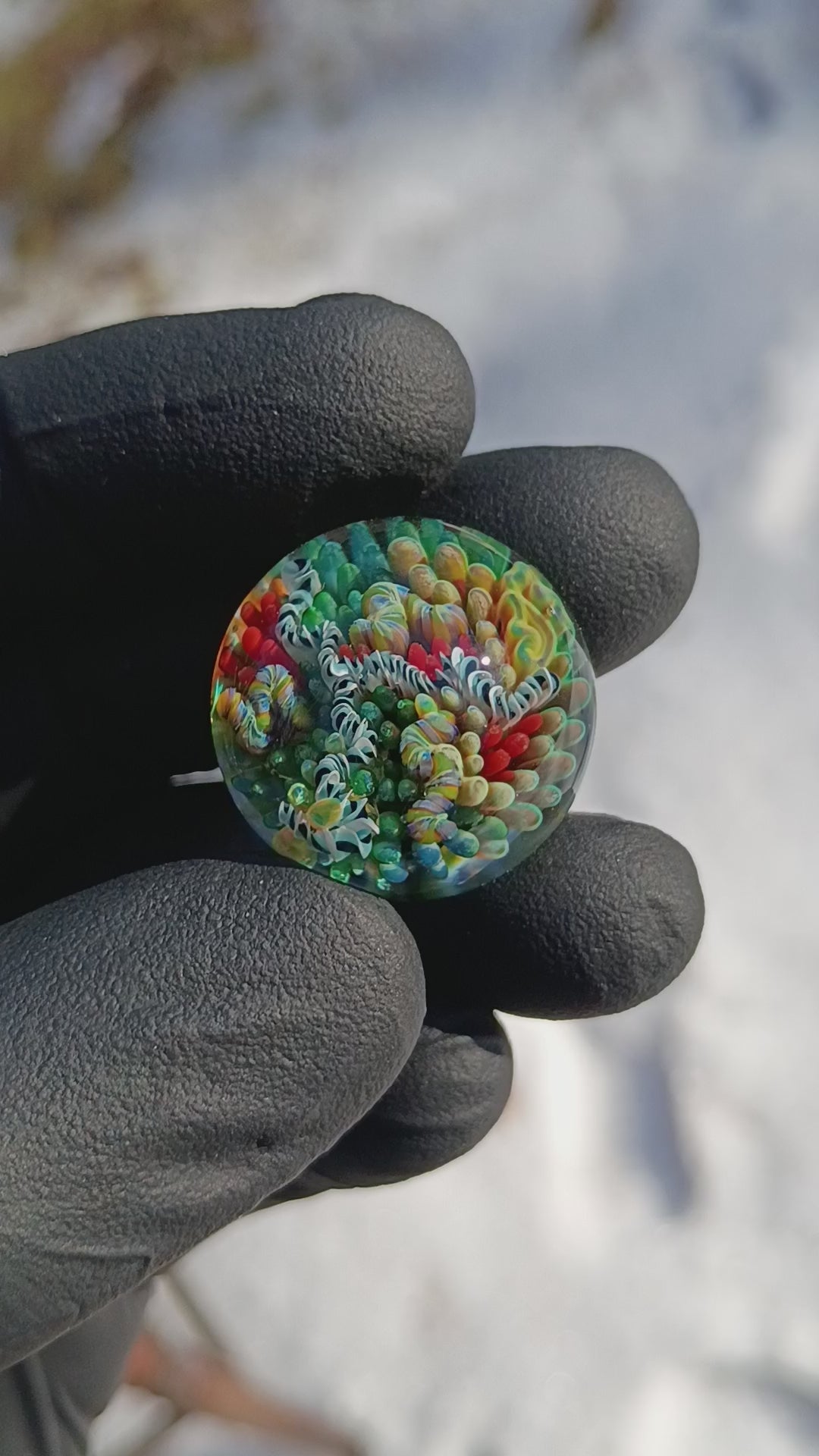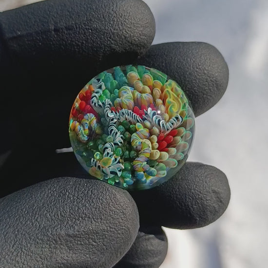 I start by blowing a thin bubble of glass, then carefully pull individual colored strings to create the coral reef details, including coral branches, anemones, and tiny dots reminiscent of sand, entirely by hand. Once the design is complete, I heat and implode the piece into a solid marble, cut the tubing, and flip it to reveal the intricate “painted” designs. Finally, I remove excess clear glass to form a clean lens that magnifies the miniature reef, bringing every detail to life.