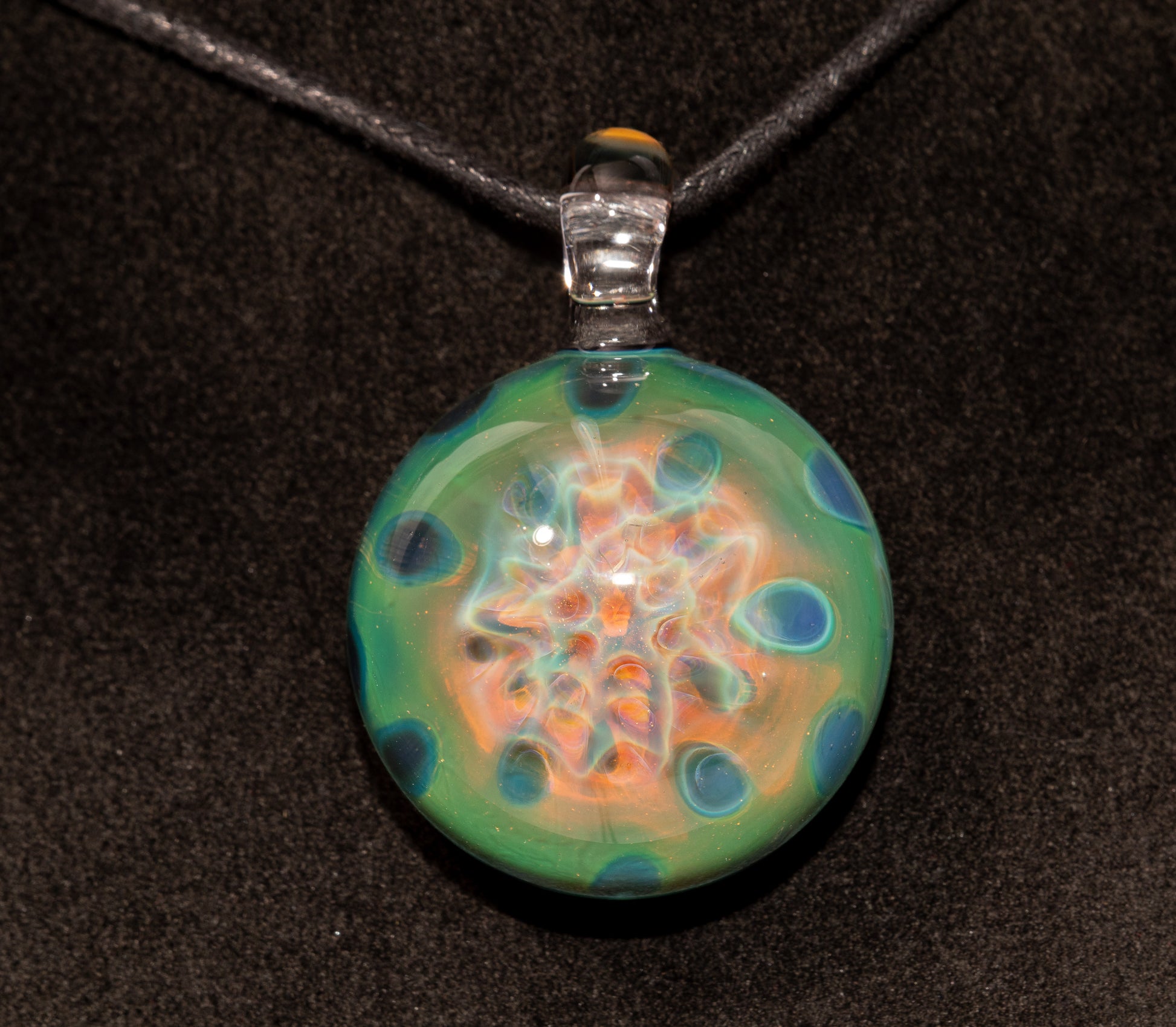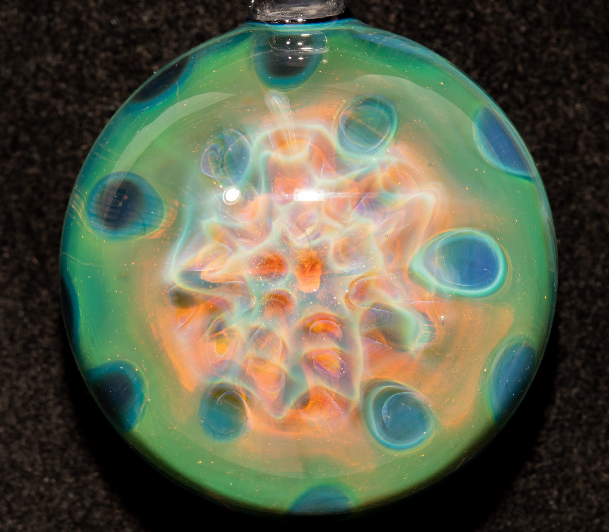 Next, dozens of clear dots are applied in a honeycomb array, pulling the fumed colors inward like a swirling vortex. The bubble is then collapsed and shaped into a solid lens, locking the pattern in place. Finally, the back is coated in deep jet black to enhance the sense of depth and reveal the pendant’s full iridescent rainbow from within.