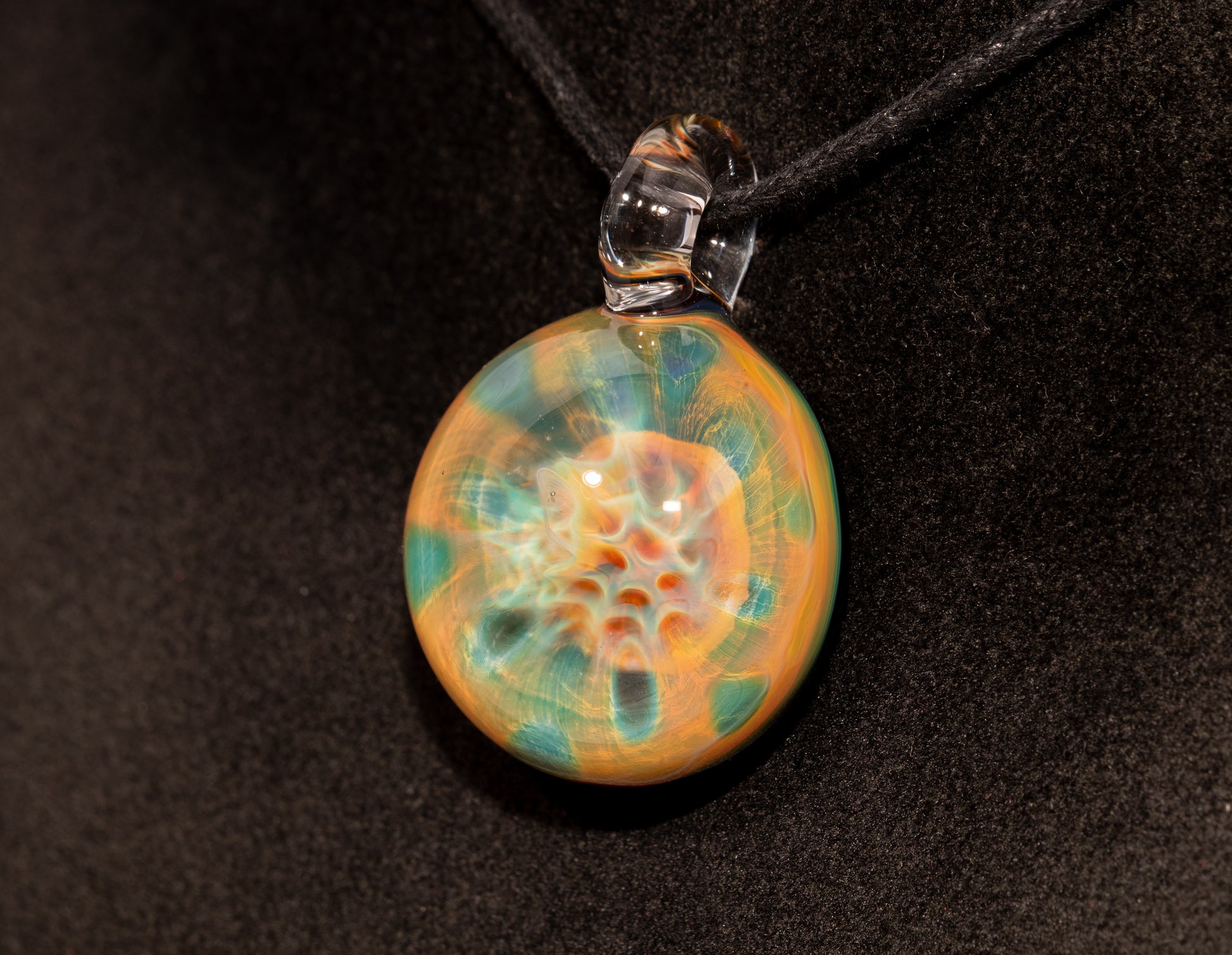 Next, dozens of clear dots are applied in a honeycomb array, pulling the fumed colors inward like a swirling vortex. The bubble is then collapsed and shaped into a solid lens, locking the pattern in place. Finally, the back is coated in deep jet black to enhance the sense of depth and reveal the pendant’s full iridescent rainbow from within.