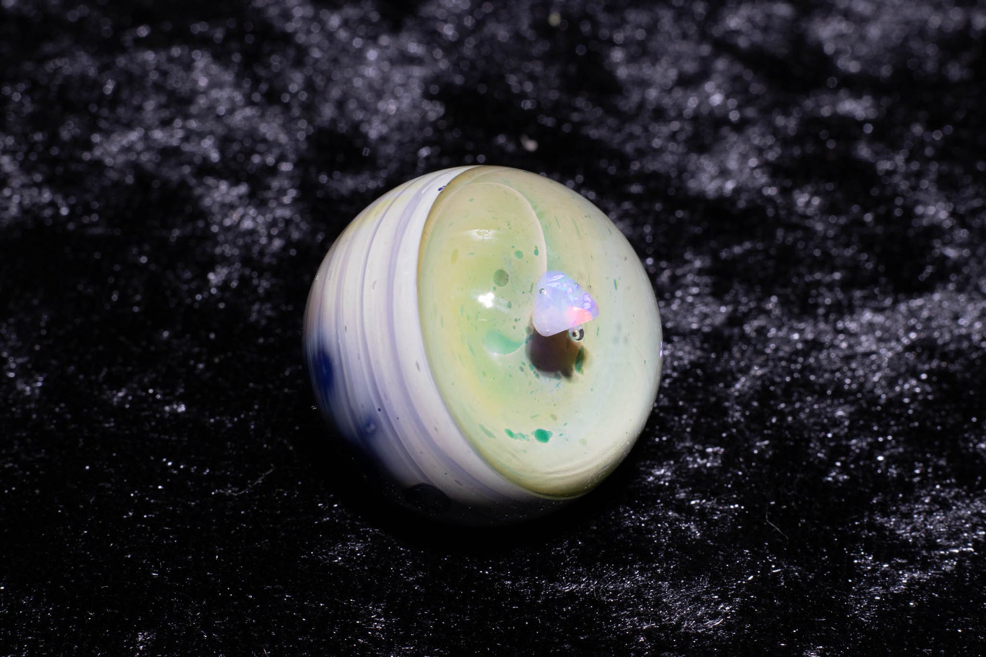 This opal slurper set comes with a 24mm Opal marble, 10mm valve, 7mm pearl, and a 5x20mm pillar. There is an encased opal in the center of this full colored marble. The sparkle and shine is beautiful in person!