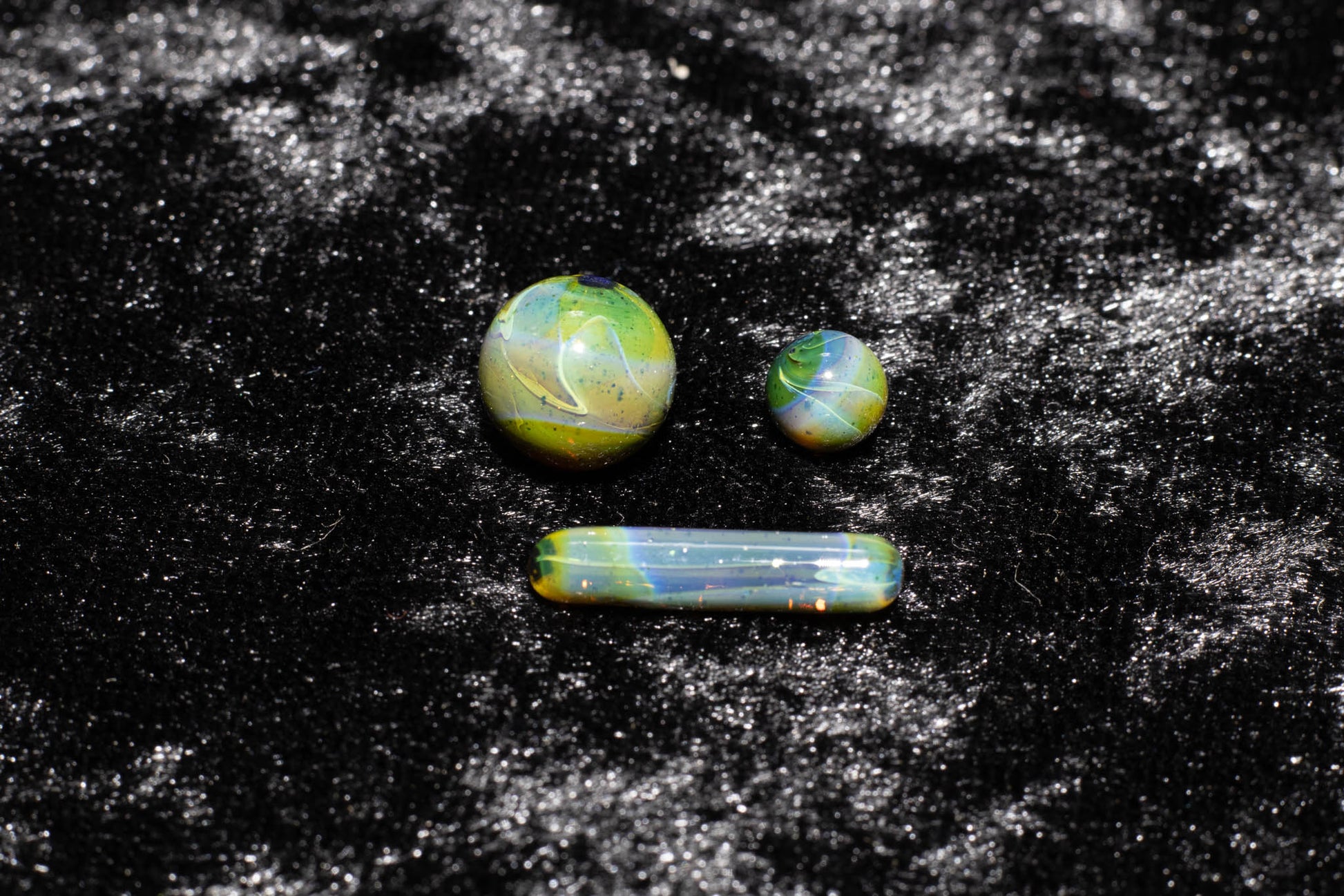 This opal slurper set comes with a 24mm Opal marble, 10mm valve, 6mm pearl, and a 4x18mm pillar. There is an encased opal in the center of this full colored marble. The sparkle and shine is beautiful in person!