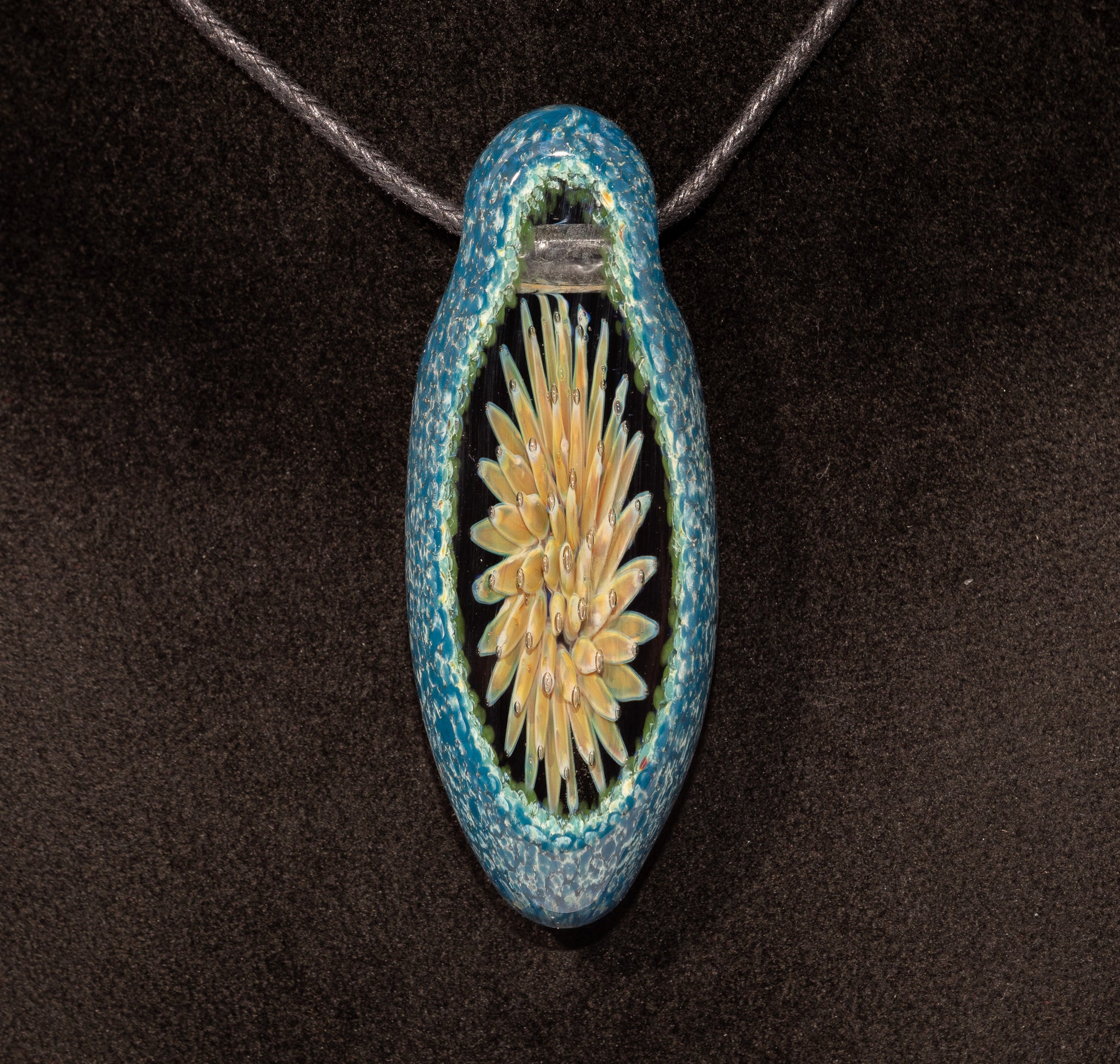 Then I use a lapidary flat lap to cut a clean facet into the front, revealing the hidden fractal-like core inside the “geode.” That’s where the real work begins, I spend hours at the wheel, moving through nine stages of grinding from coarse 80 grit all the way up to 3000. It’s a slow, focused process that actually takes me much longer than making the pendant itself. Once the shaping is perfect, I polish with cerium oxide to bring out a gem-like shine. Inside the glass, the intricate geometry is frozen in time, a radiant crystalline pattern suspended forever at its brightest moment.
