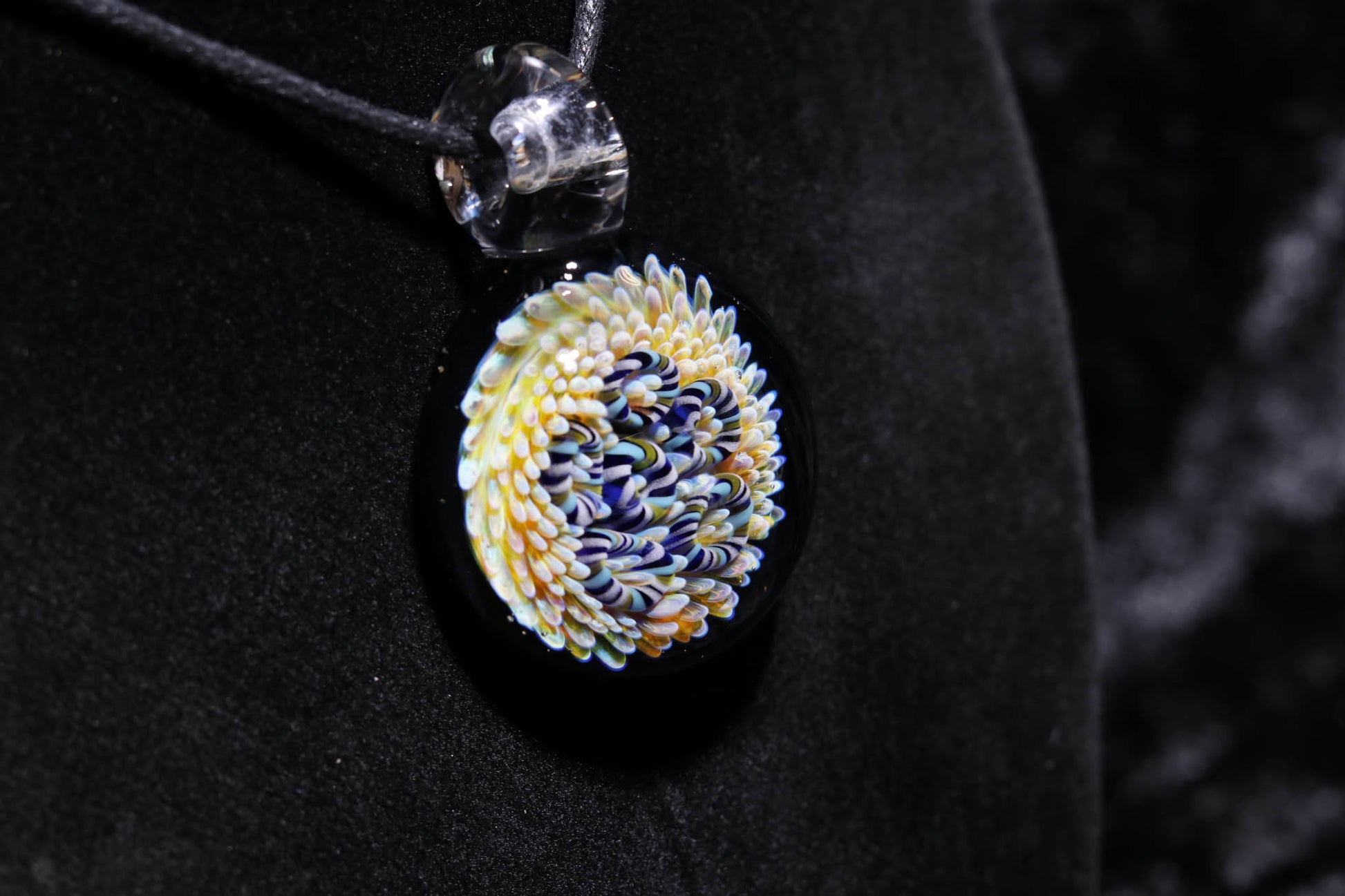 This glass coral reef implosion pendant is made with a bunch of detail, to make you dream of the sea! I blow out a large, thin, clear bubble and pull down multiple strings of colored glass. I use different colors of glass and techniques to "paint" dots, reefs, spirals, and twists to create a bustling ocean reef. All colors are custom mixed for the reef pendants. I make my own latticinio twists for the coral, some have thin strips of sparkled glass. After the scene is "painted" on the glass surface, it is very gently and slowly melted back into a solid glass puck. Then I flame cut the glass handle and flip the pendant around so the painting on the back shows through the clear front. I continue to heat the edges and allow it to slump around the colors, while pressing it flat on a graphite marver. This causes the coral reef scene to implode deep inside the glass. This gives a beautiful ocean like reef with so much depth. Out of all the pendants I make, these are the most fun, but are the hardest, especially since I never know how they will look until that flip and final heat on the torch!
