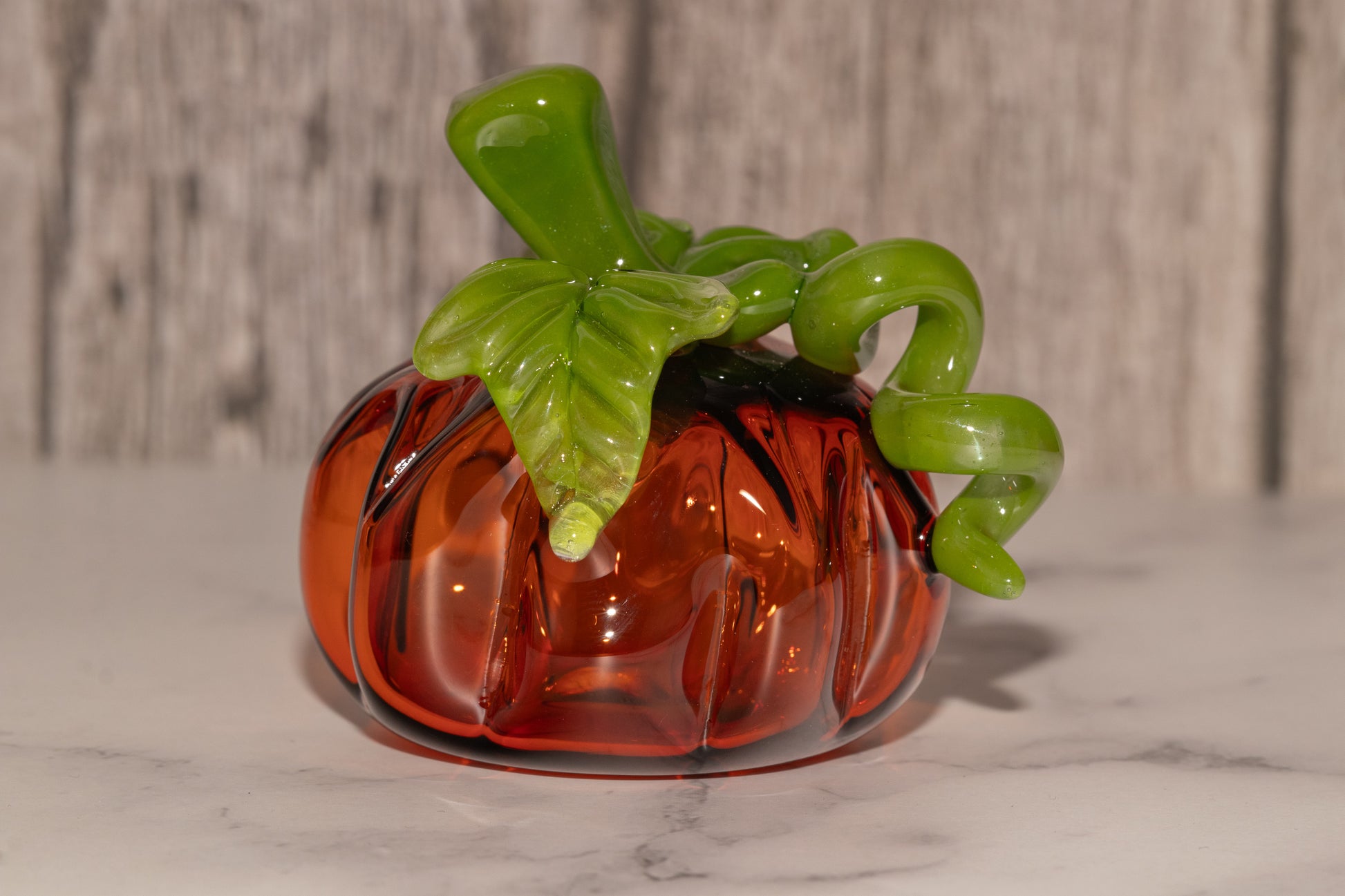 Glass Pumpkin #1 | Handblown OOAK Fall Sculpture | Autumn Home Decor | Halloween Decoration | Leaves & Green Vine Detail | Collectible Art