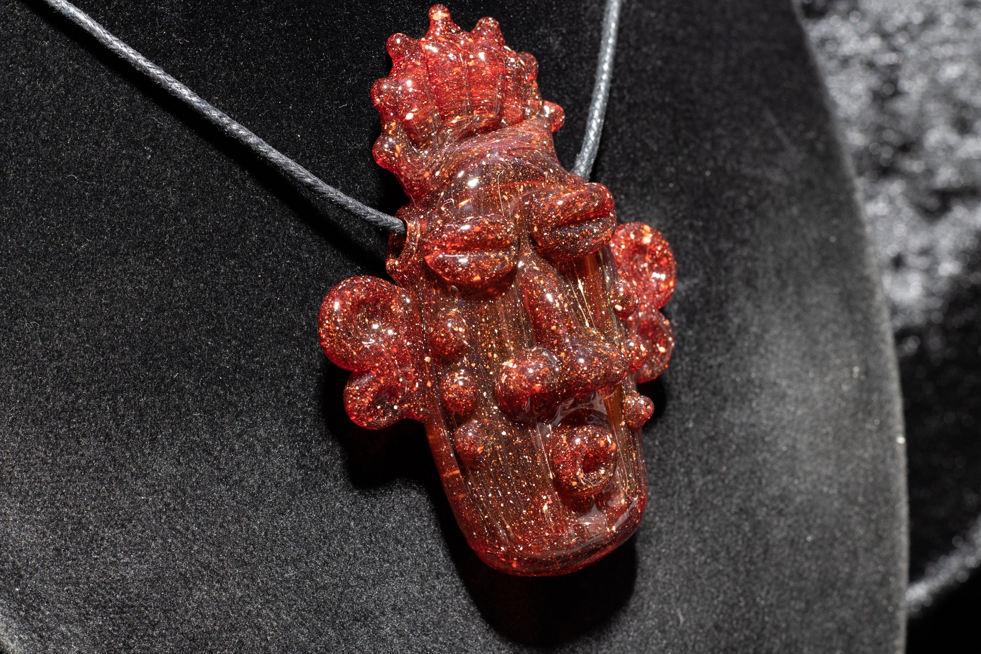 This glass Tiki pendant is made with the color Red Blizzard, a dark red with flecks of white. I layered the color over a thick glass tube and sculpted all the details including the crown with the same color. Perfect for a night out at the local tiki bar, or just to show off your love for the Cult of Tiki!!🍍🗿