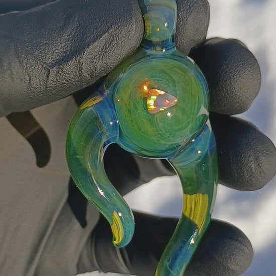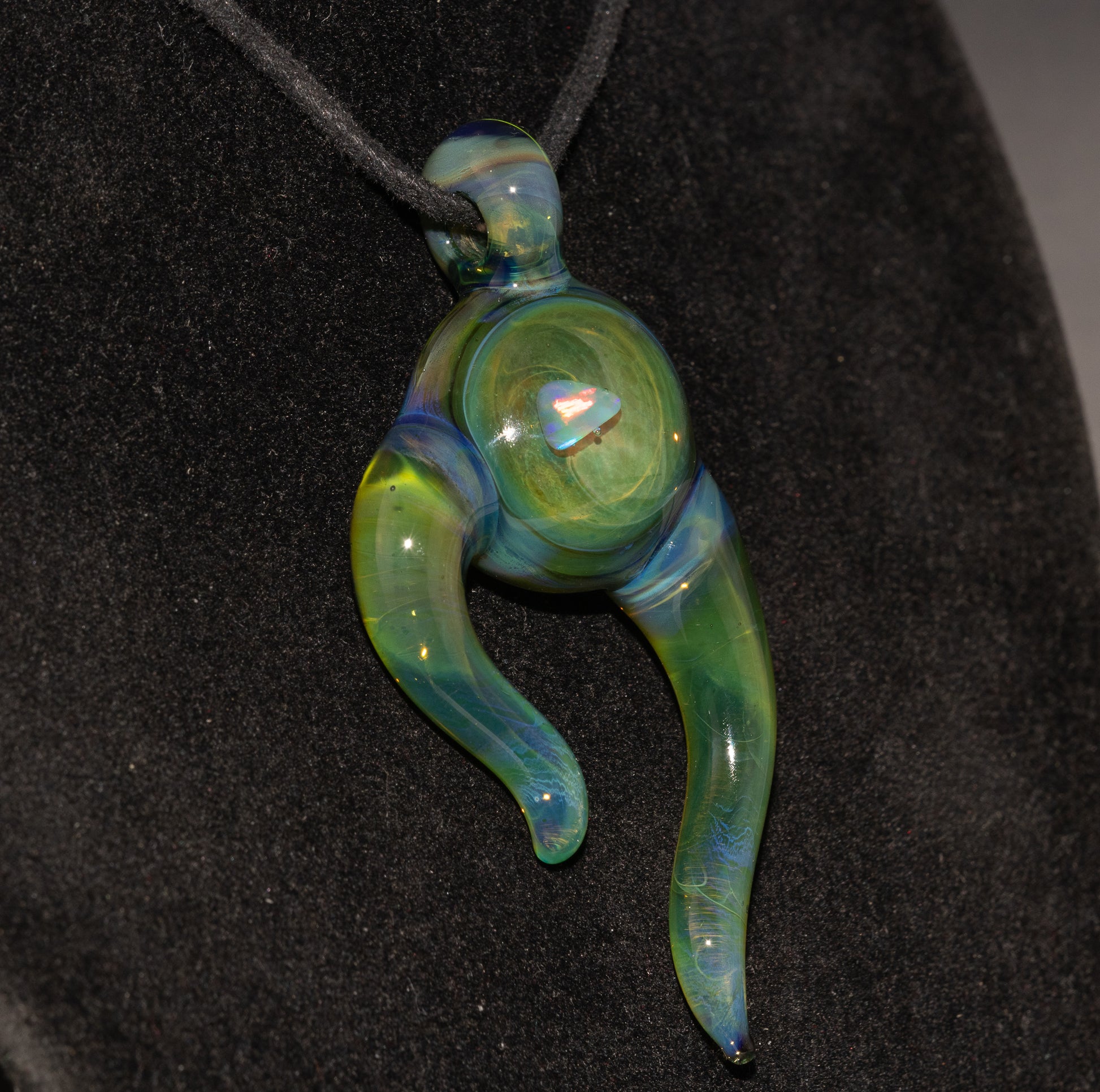 This glass pendant features a bright, white opal suspended within layers of clear borosilicate glass, creating an ethereal floating effect. I start with encasing a polished opal into a clear glass tube and then condense it into a solid marble. This marble is then pressed into a puck of colored glass. Two matching horns are formed, melted in, and allowed to naturally droop in the flame allowing this flowing organic form to shape itself.