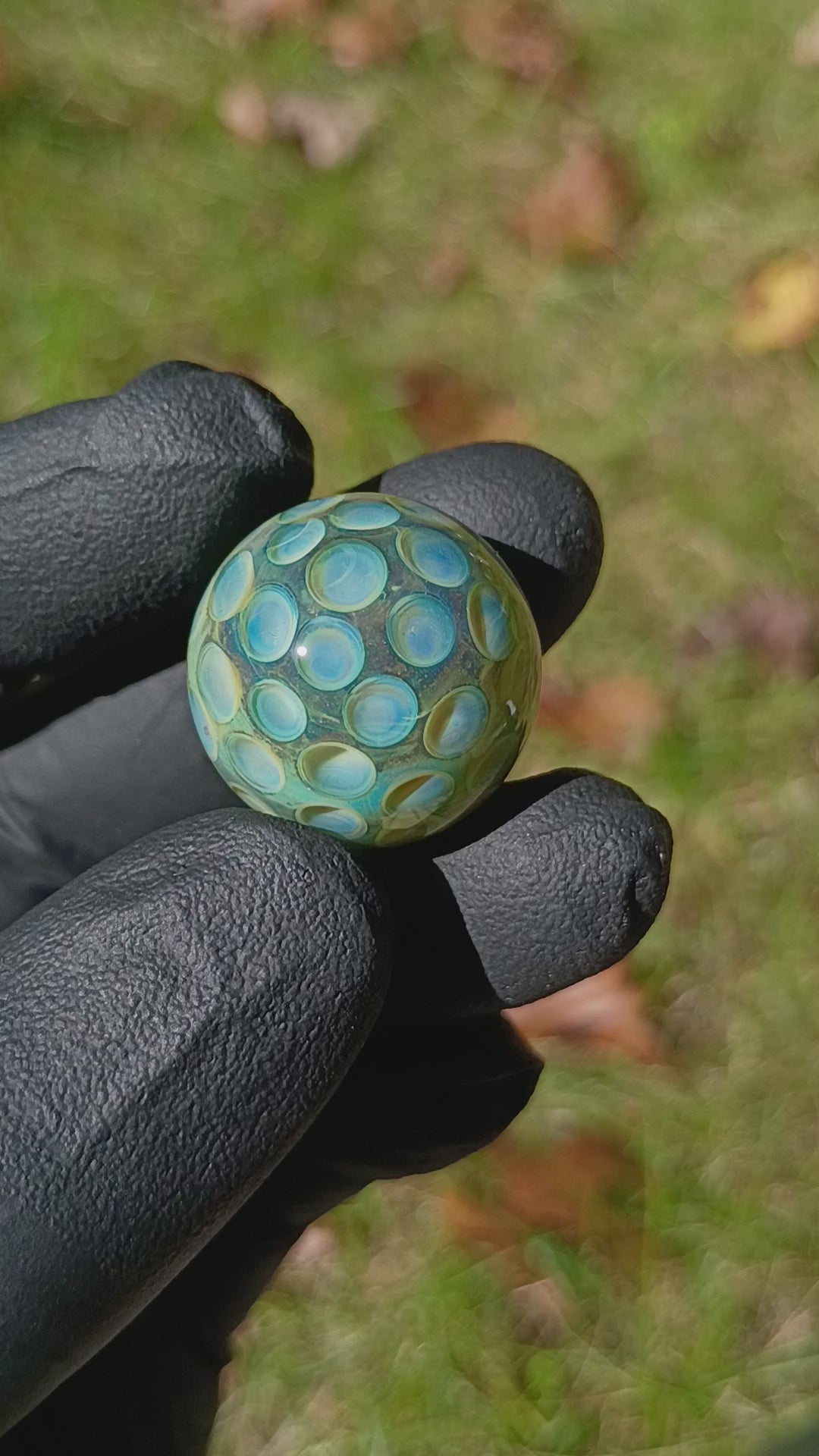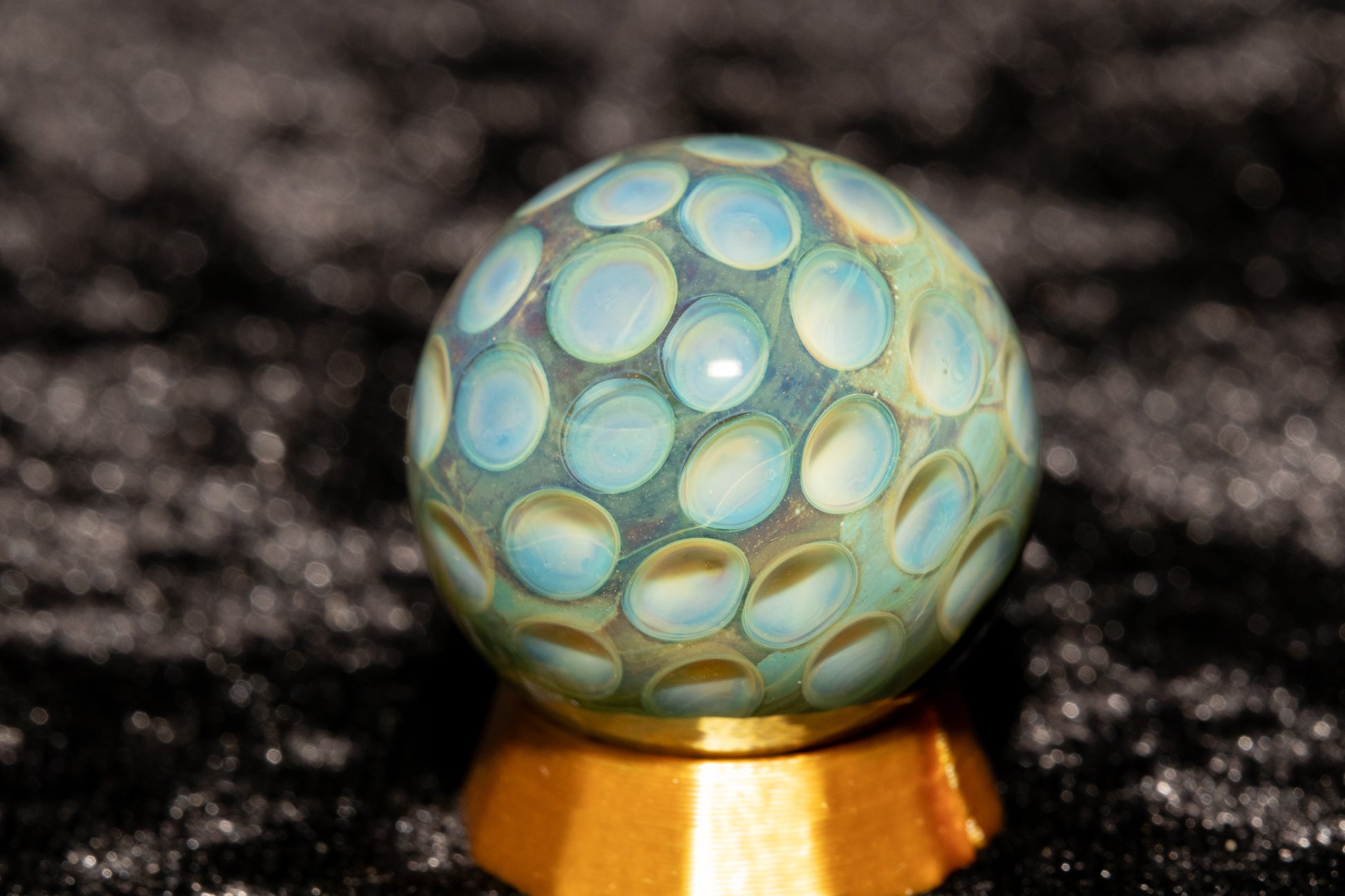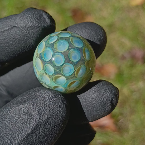 Description: Carry the timeless symbol of transformation and perseverance with this handmade lotus pod inspired marble. Its design features deep, rounded pockets within a multi colored body, echoing the natural pattern of a dried lotus seed pod. The result is a striking, organic look that blends sculptural texture with the luminous clarity of glass.