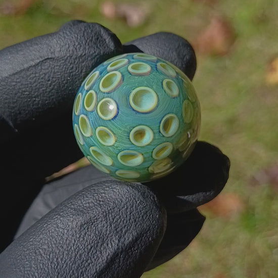 Description: Carry the timeless symbol of transformation and perseverance with this handmade lotus pod inspired marble. Its design features deep, rounded pockets within a multi colored body, echoing the natural pattern of a dried lotus seed pod. The result is a striking, organic look that blends sculptural texture with the luminous clarity of glass.