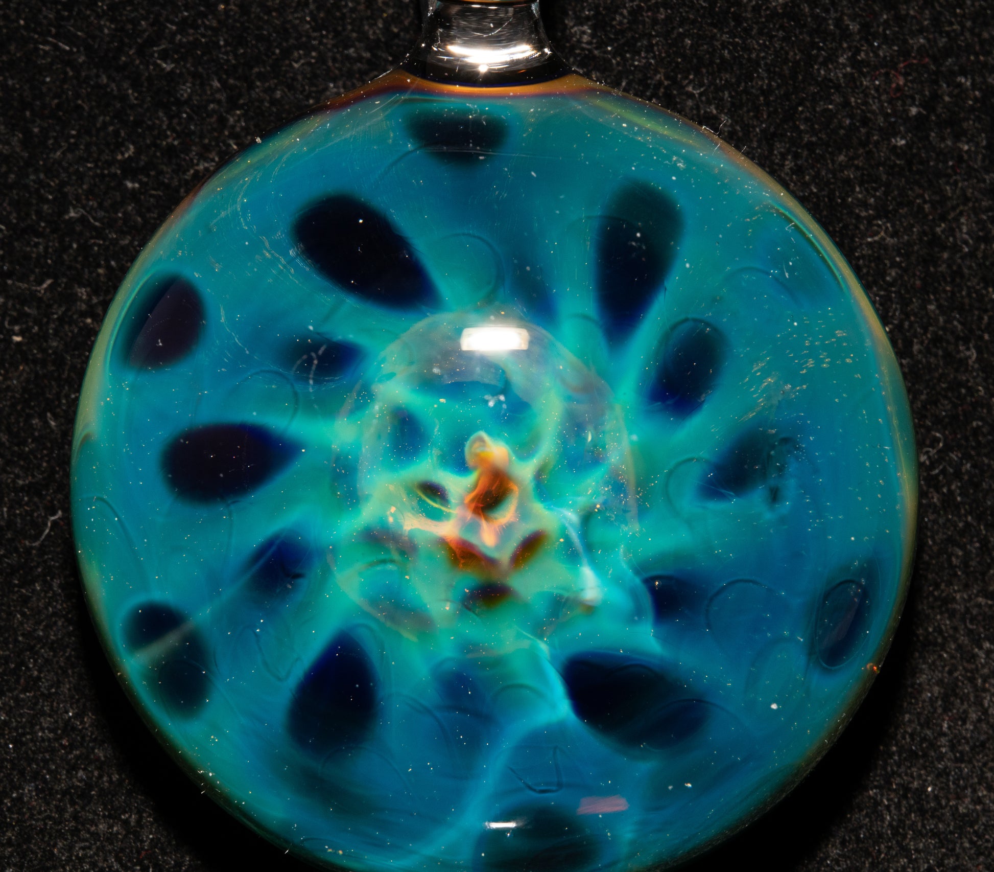 From there, dozens of clear dots are applied in a honeycomb pattern, drawing the fumed colors inward like a vortex. The bubble is collapsed and melted into a solid lens, preserving the dots. The back is coated in sparkled black to enhance the depth and reveal the full iridescent rainbow from within.
