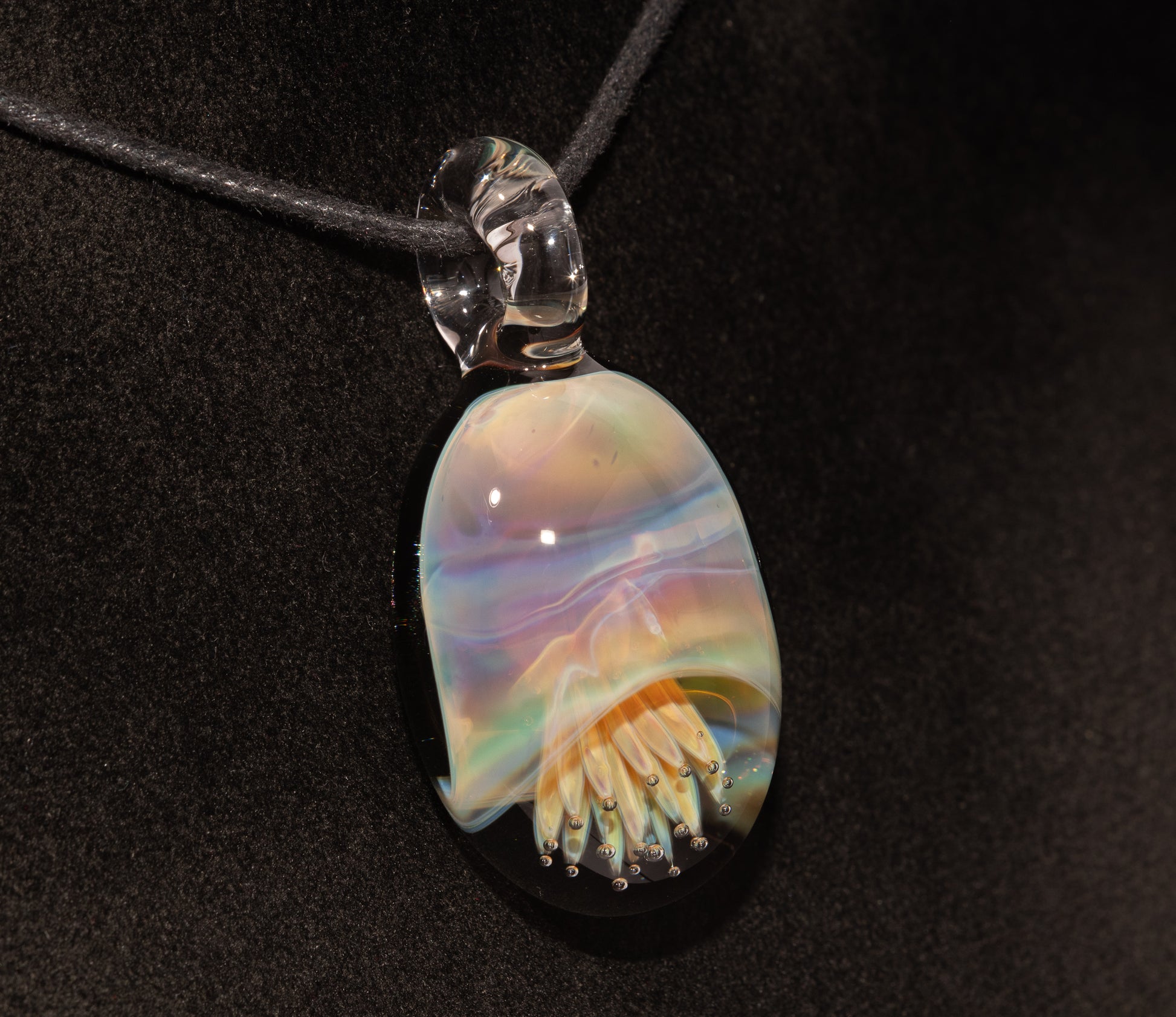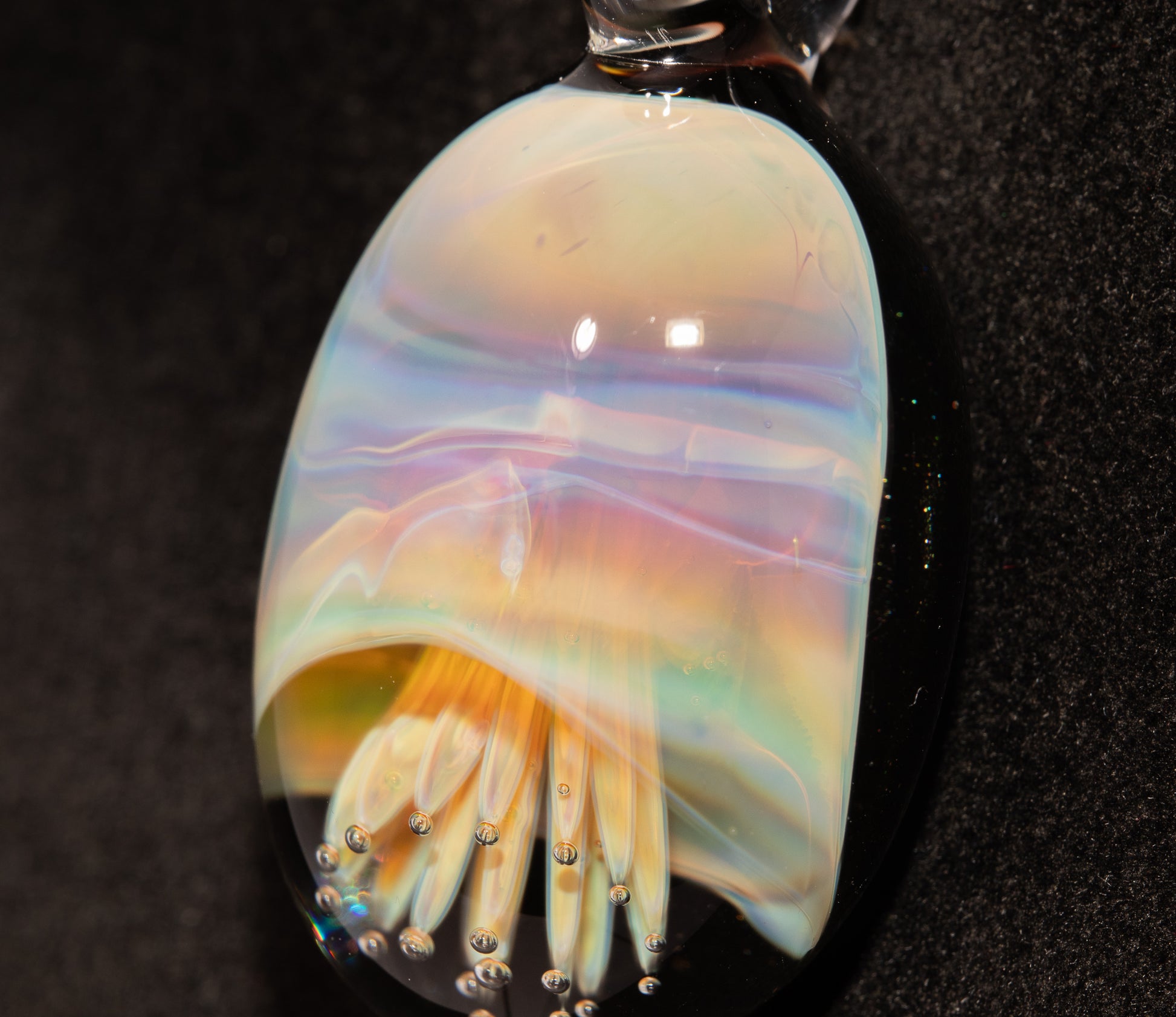 From molten glass to a moment of ocean wonder, this pendant captures a drifting jellyfish in timeless motion.