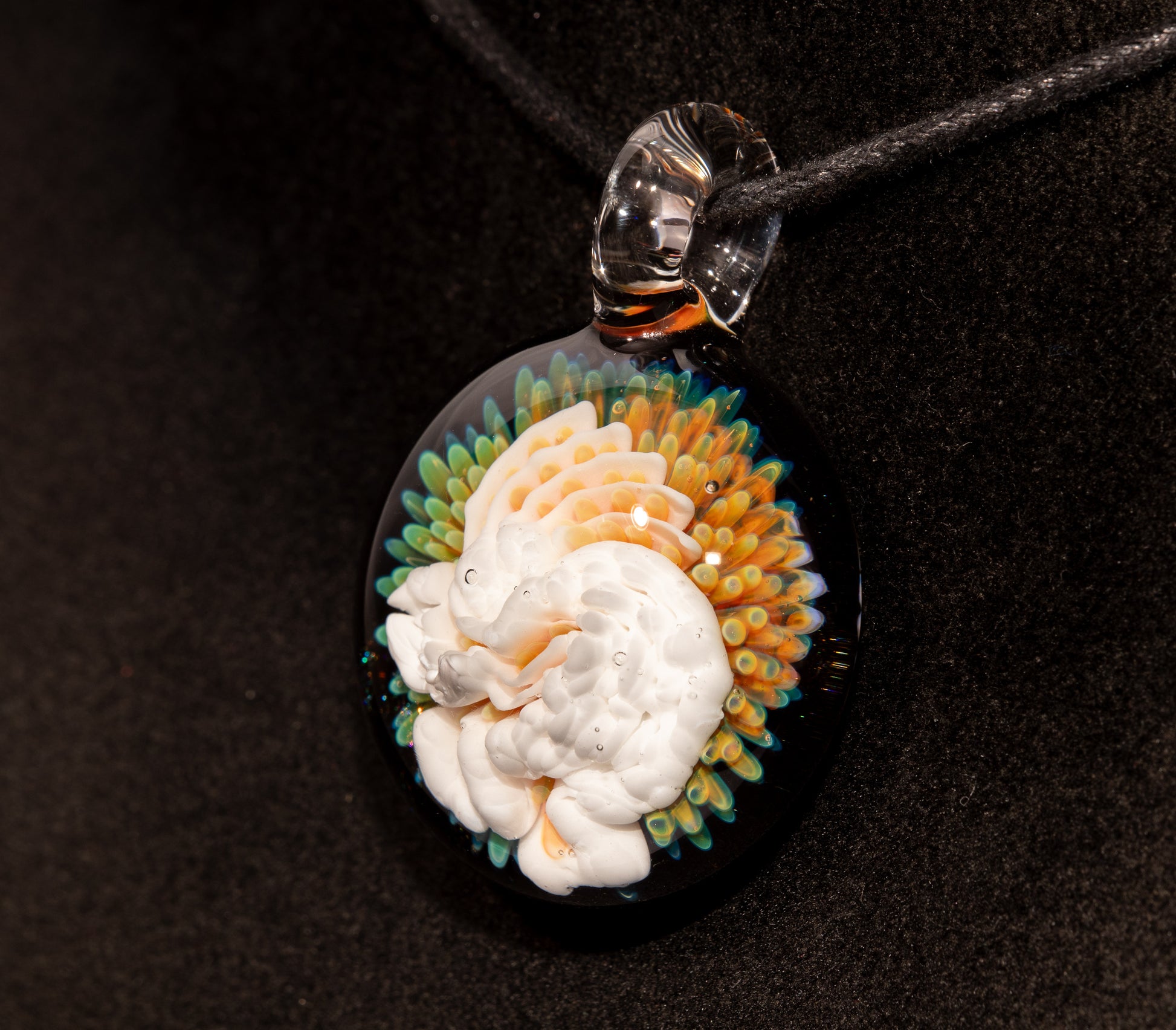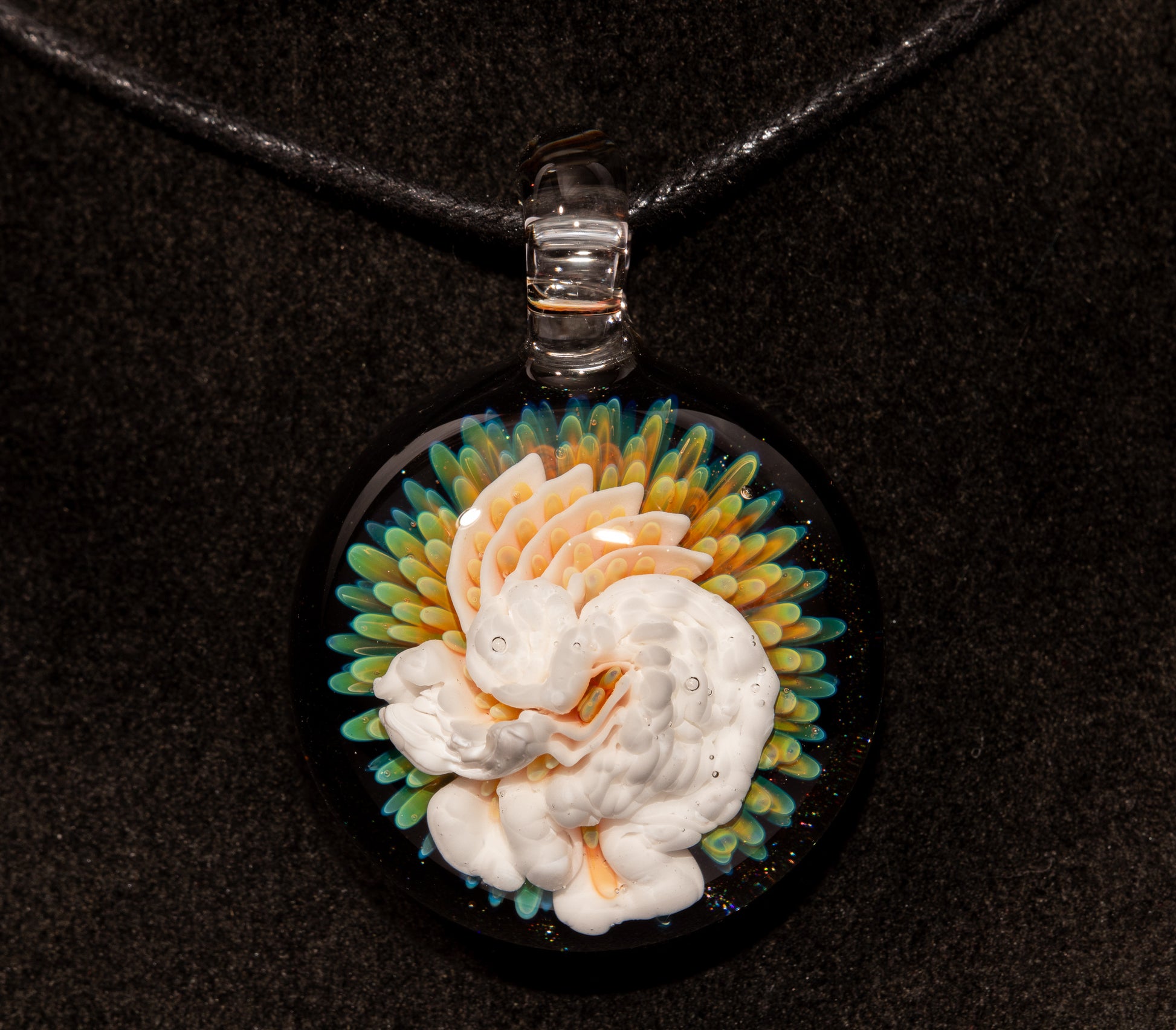 This handmade glass pendant features Kokopelli, the iconic flute-playing figure known across many Indigenous cultures of the Southwest. A bringer of music, fertility, and good fortune, Kokopelli dances across this piece in bright desert-inspired colors and bold contrast.