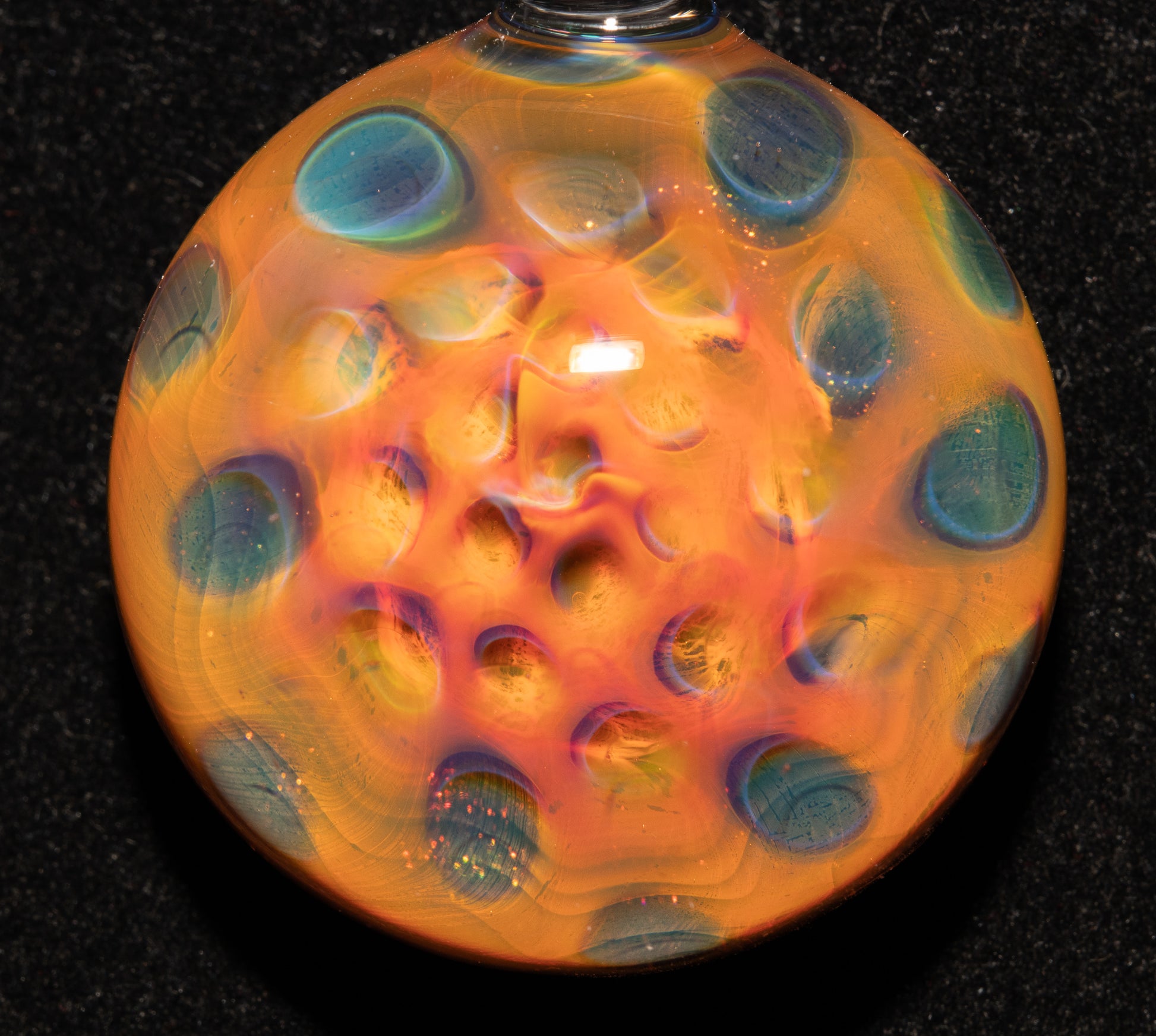 From there, dozens of clear dots are applied in a honeycomb pattern, drawing the fumed colors inward like a vortex. The bubble is collapsed and melted into a solid lens, preserving the dots. The back is coated in sparkled black to enhance the depth and reveal the full iridescent rainbow from within.