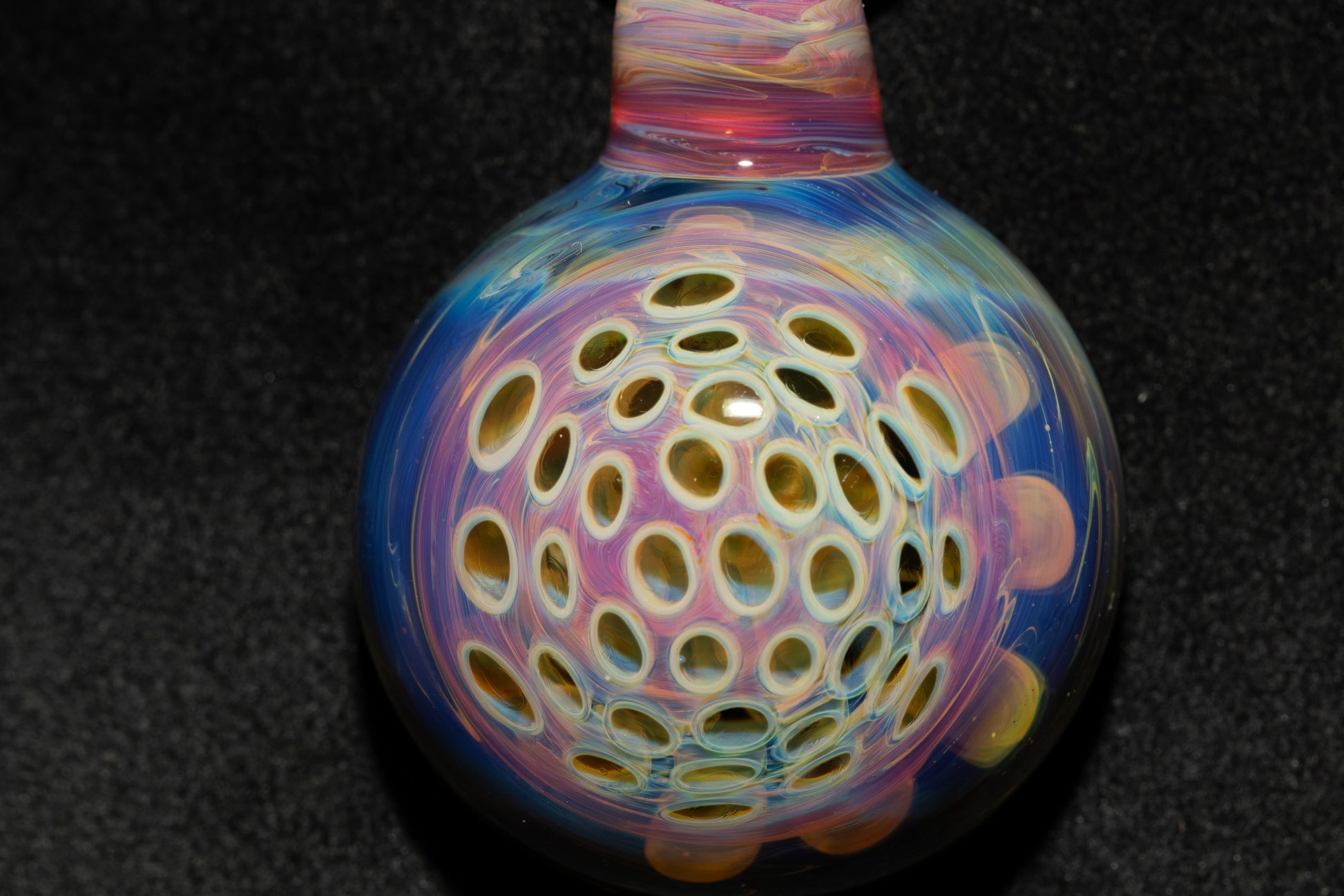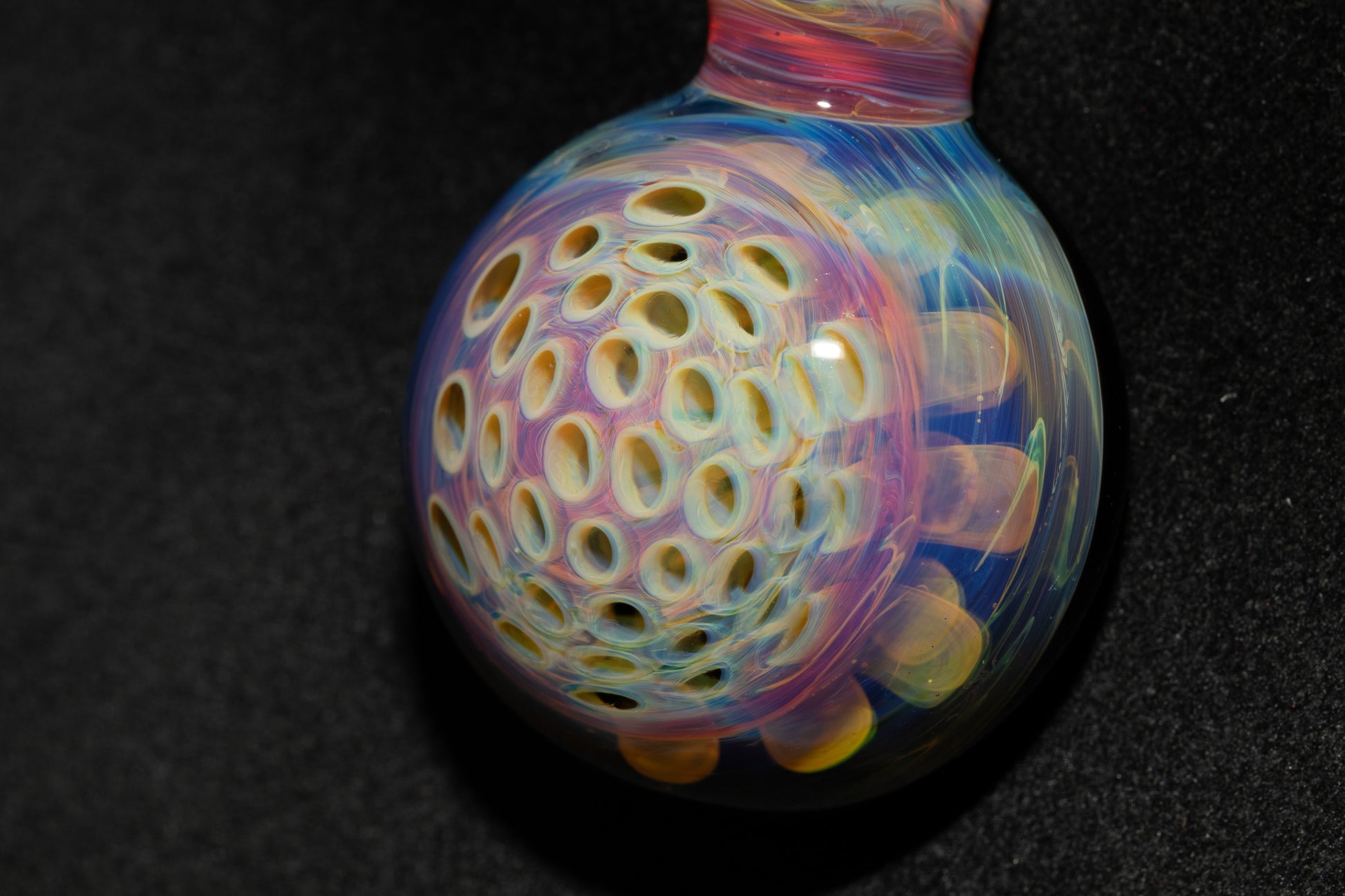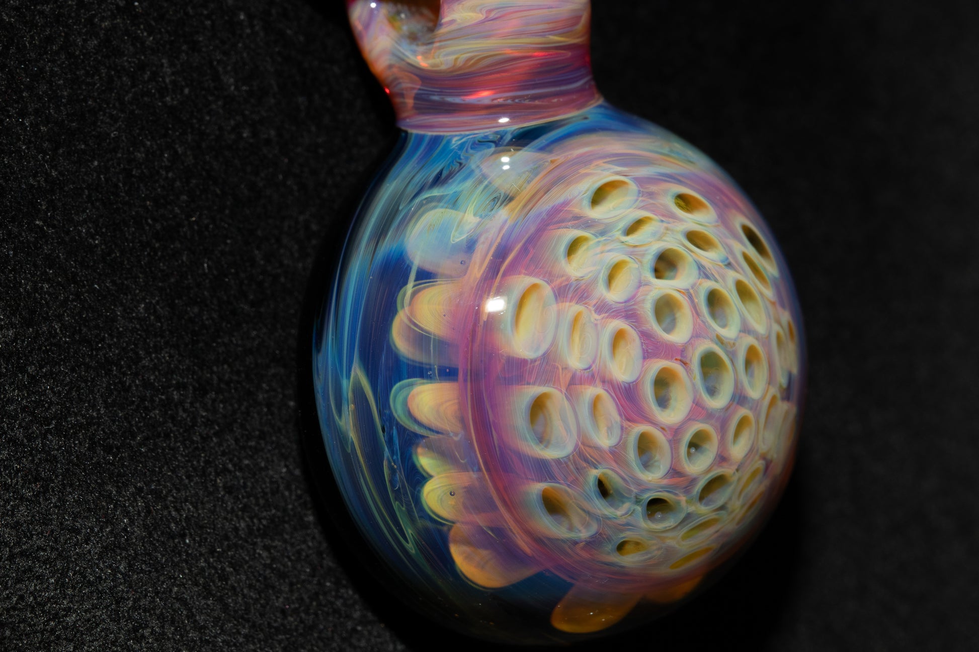 This pendant’s thick, clear form adds depth and durability while allowing light to play across the intricate pod-like shapes within. Whether worn for its symbolism, admired for its artistry, or collected as a unique piece of glasswork, it is a pendant that speaks to both