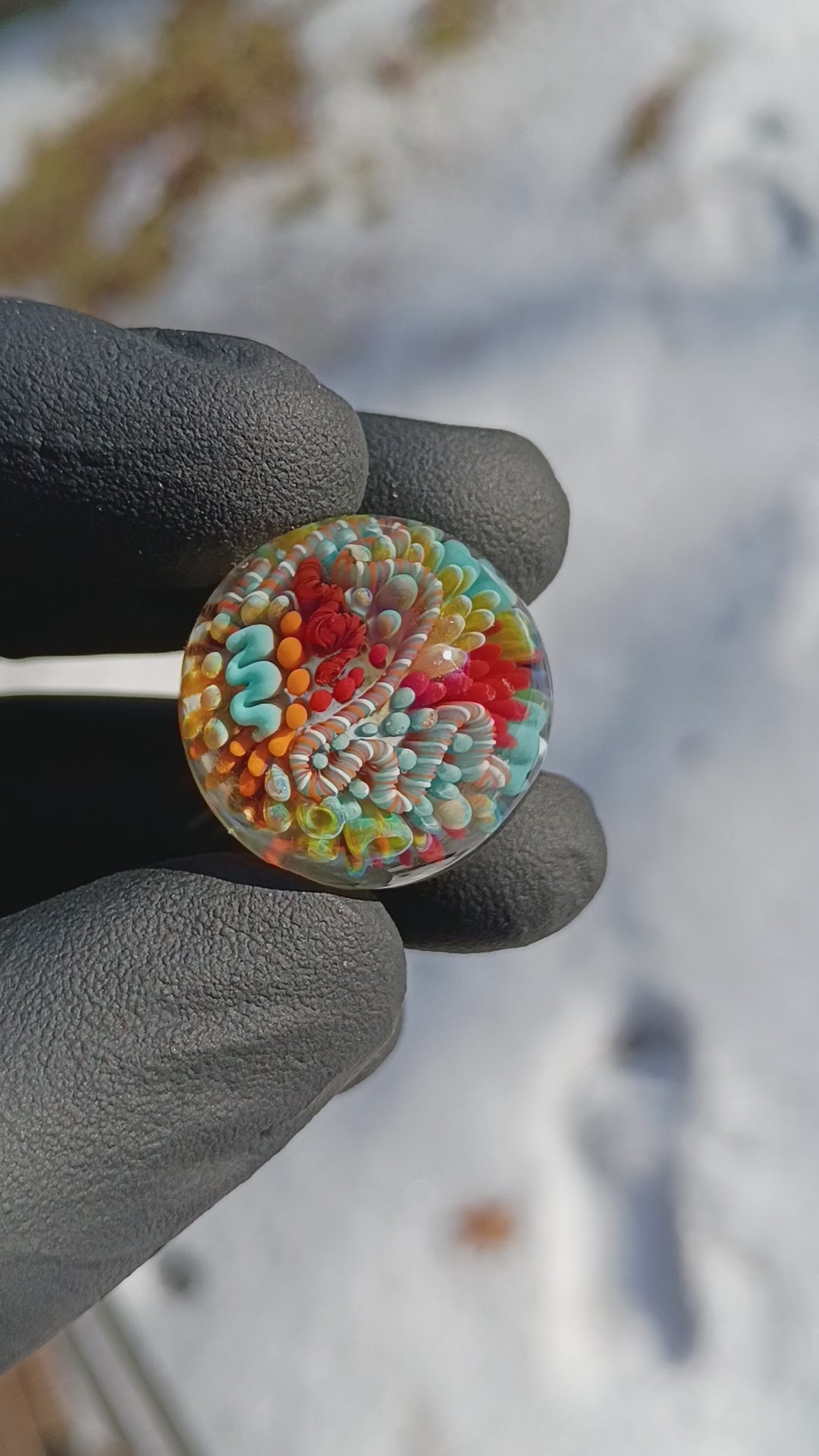 I start by blowing a thin bubble of glass, then carefully pull individual colored strings to create the coral reef details, including coral branches, anemones, and tiny dots reminiscent of sand, entirely by hand. Once the design is complete, I heat and implode the piece into a solid marble, cut the tubing, and flip it to reveal the intricate “painted” designs. Finally, I remove excess clear glass to form a clean lens that magnifies the miniature reef, bringing every detail to life.