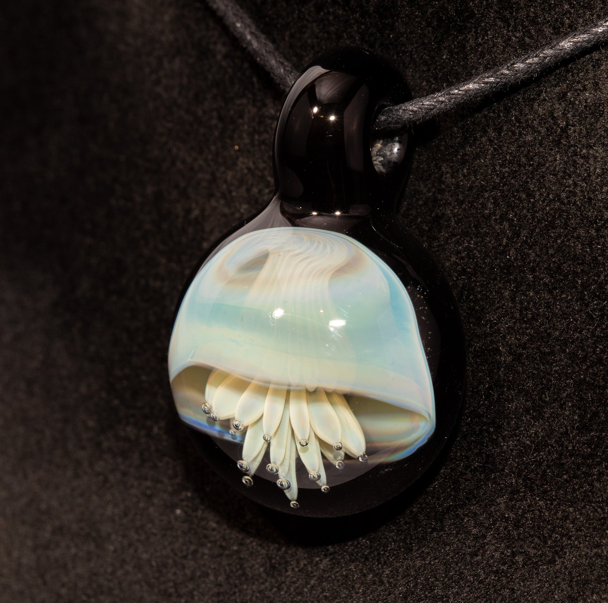 From molten glass to a moment of ocean wonder, this pendant captures a drifting jellyfish in timeless motion.