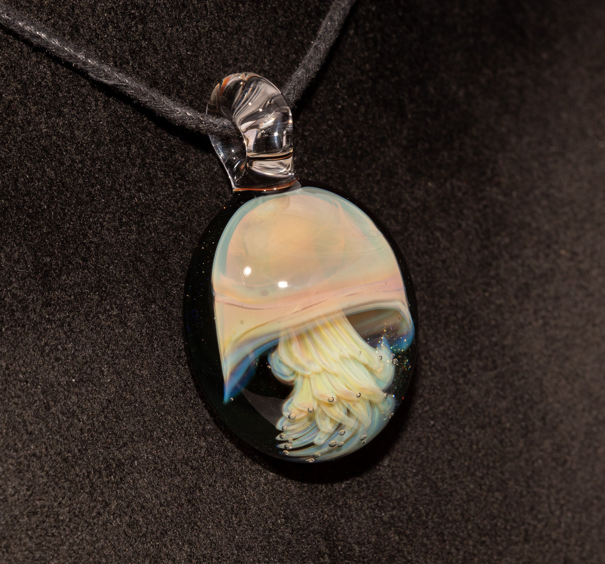 From molten glass to a moment of ocean wonder, this pendant captures a drifting jellyfish in timeless motion.