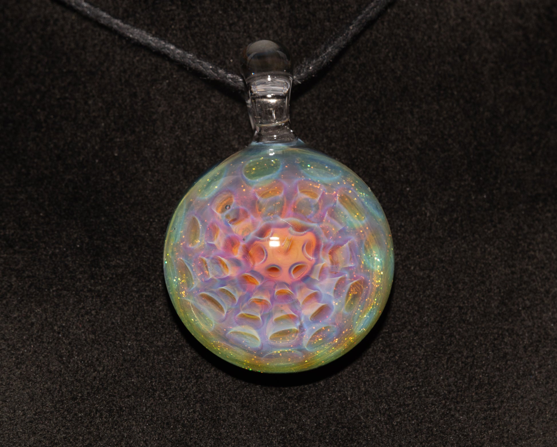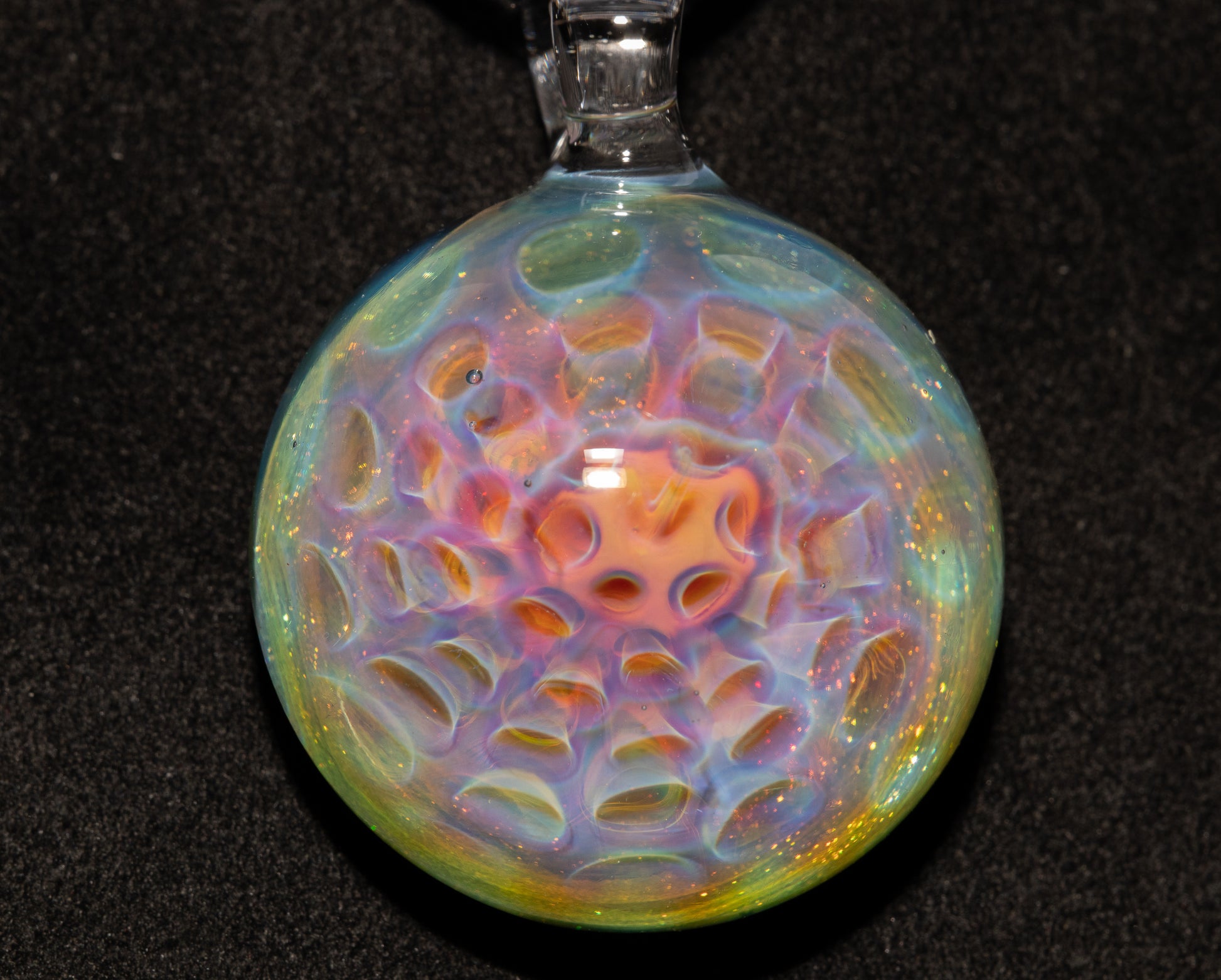 From there, dozens of clear dots are applied in a honeycomb pattern, drawing the fumed colors inward like a vortex. The bubble is collapsed and melted into a solid lens, preserving the dots. The back is coated in a sparkled blue to enhance the depth and reveal the full iridescent rainbow from within.