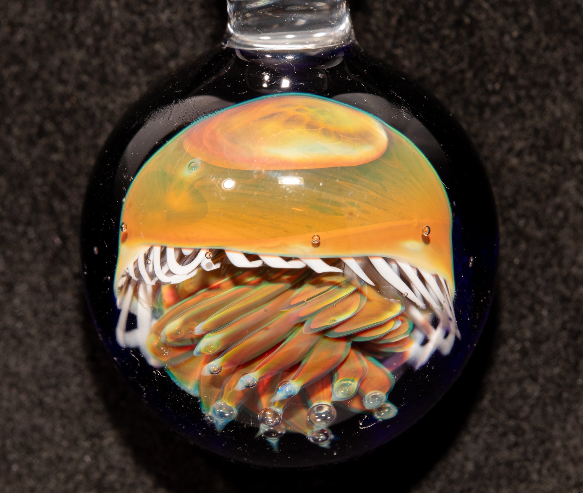 From molten glass to a moment of ocean wonder, this pendant captures a drifting jellyfish in timeless motion.
