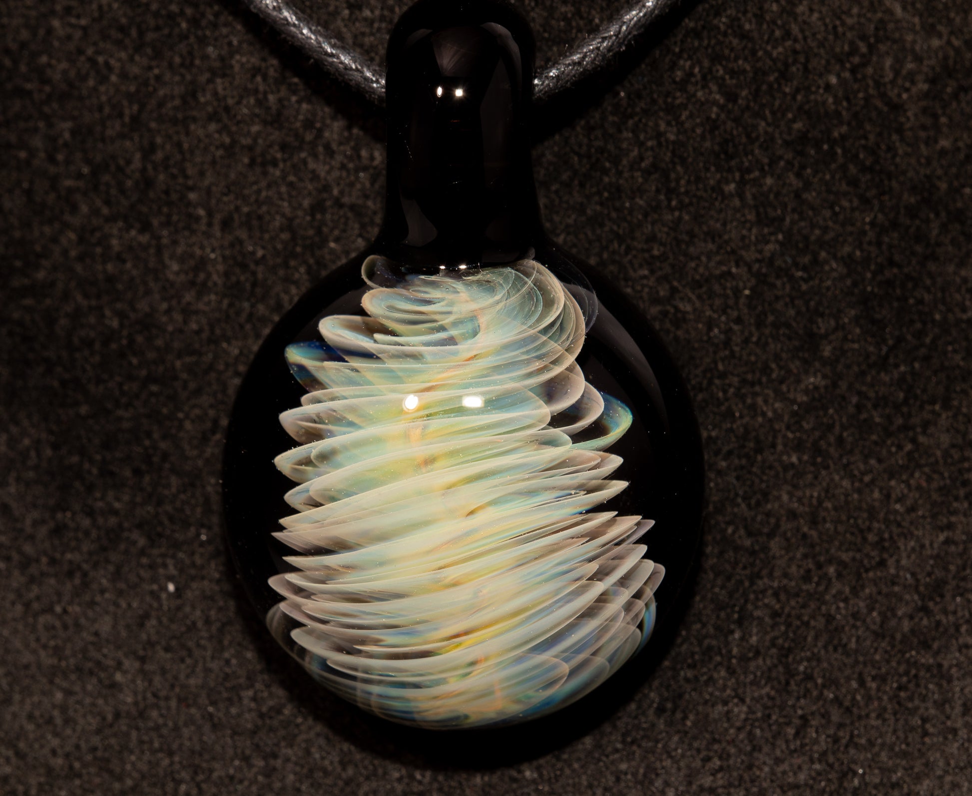 This silver-fumed glass pendant captures the motion of a swirling storm. Each delicate line is fumed from 99.99% fine silver, then encased in crystal-clear glass and twisted into a graceful tornado spiral. Handblown and one of a kind, perfect for storm chasers of beauty and light.